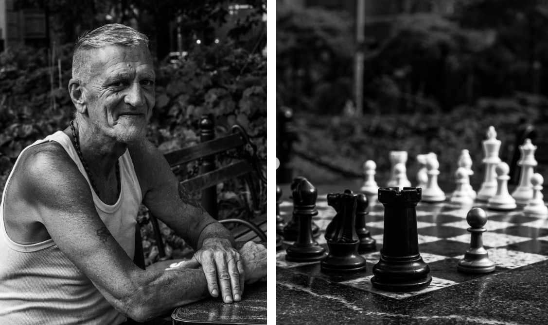 그래서 저는 체스 판을 샀어요. 처음에는 전 세계에서 온 낯선 사람들에게 혼쭐이 났지요. 하지만 게임을 거듭하면서 기본기를 익히고 다른 모든 것을 배우게 되었습니다. 그리고 지금은 게임을 하고 싶어하는 모든 사람에게 가르치는 입장이 되었지요. 기부금을 받기도 하지만 제가 얻는 열매는 돈이 아닌, 사람들이 앉아 저와 시간을 함께 하는 그 짧은 시간이지요. 제가 열매라고 부르는 게 이상하죠? 15분, 30분 동안 누군가와 함께 활동을 공유하면 영혼에 영양분이 공급되는 것을 알게 됩니다. 상대를 바라보고, 웃고, 나쁜 수를 두거나 좋은 수를 두는 모든 것이 저와 그 사람의 삶에 있어 영양분이 되죠. 체스 덕분에 저는 선과 악의 차이를 목격하기도 합니다 (I bought myself a chess board. In the beginning I got the shit kicked out of me by strangers from all over the world. But I grew game after game, learning the fundamentals, then learning all the other stuff. And now I teach them to anybody who wants to play. I get donations, but it’s not the money that’s the fruit of my take. It’s when people sit down. I call it fruit, is that weird? Because when you share an activity with someone for fifteen minutes, a half hour—it nourishes your soul. Me looking at you, us laughing, doing bad moves, good moves— it’s all so nourishing. Because of chess I got to witness the difference between good and evil).