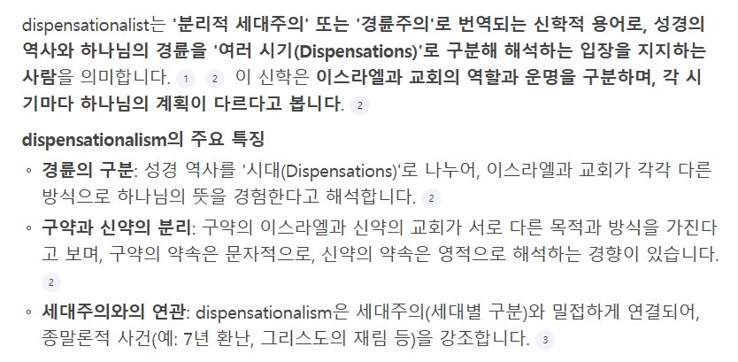 저는 dispensationalist입니다. 이 단어에 대해 한국어로는 세대주의자 또는 경륜주의자라는 정의를 내리고 있지요. 하지만 저는 부분적 세대주의자 (partial dispensationalist)로, 7년 환난 (The 7-Year Tribulation) 및 환란 전 휴거 (Pre-tribulation Rapture)에 대해서는 동의하지 않습니다.