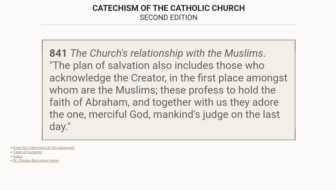 구교는 위 주제 (예수님의 재림)에 대해 어떤 견해를 가지고 있는지는 모르나, 사실 이들의 의견은 관심도 없음이, 이들의 Catachism에 따르면 (문장 841: 아래) Muslim들과 Christian들은 같으며, 이는 Muslim들이 섬기는 Allah 와 God of Abraham 이 동일하다는 기록을 해 놓았기 때문입니다. 물론 이에 준하는 신격모독적 행위의 증거들은 더 많지만, 이 외 heretic 한 언행들을 4세기부터 계속해 왔기 때문에 이들의 견해는 이번 시리즈에서 배제하도록 하겠습니다. 이들을 두고 예수교도라 함은 어리석음 그 자체라는 견해입니다.