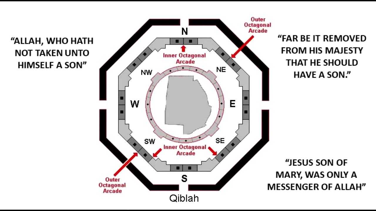아래는 Dome of the Rock (바위의 돔)의 내부입니다. 이 내부에 여러 글귀가 새겨져 있고, 그중 세 문장 글귀가 예수의 신성을 모독하는 것으로, 두 번째 사진에 그 자세한 내용이 올려져 있습니다. 그 내부 북쪽, 남남서쪽, 그리고 남남동쪽에 새겨져 있는 글귀들은 아래와 같습니다: