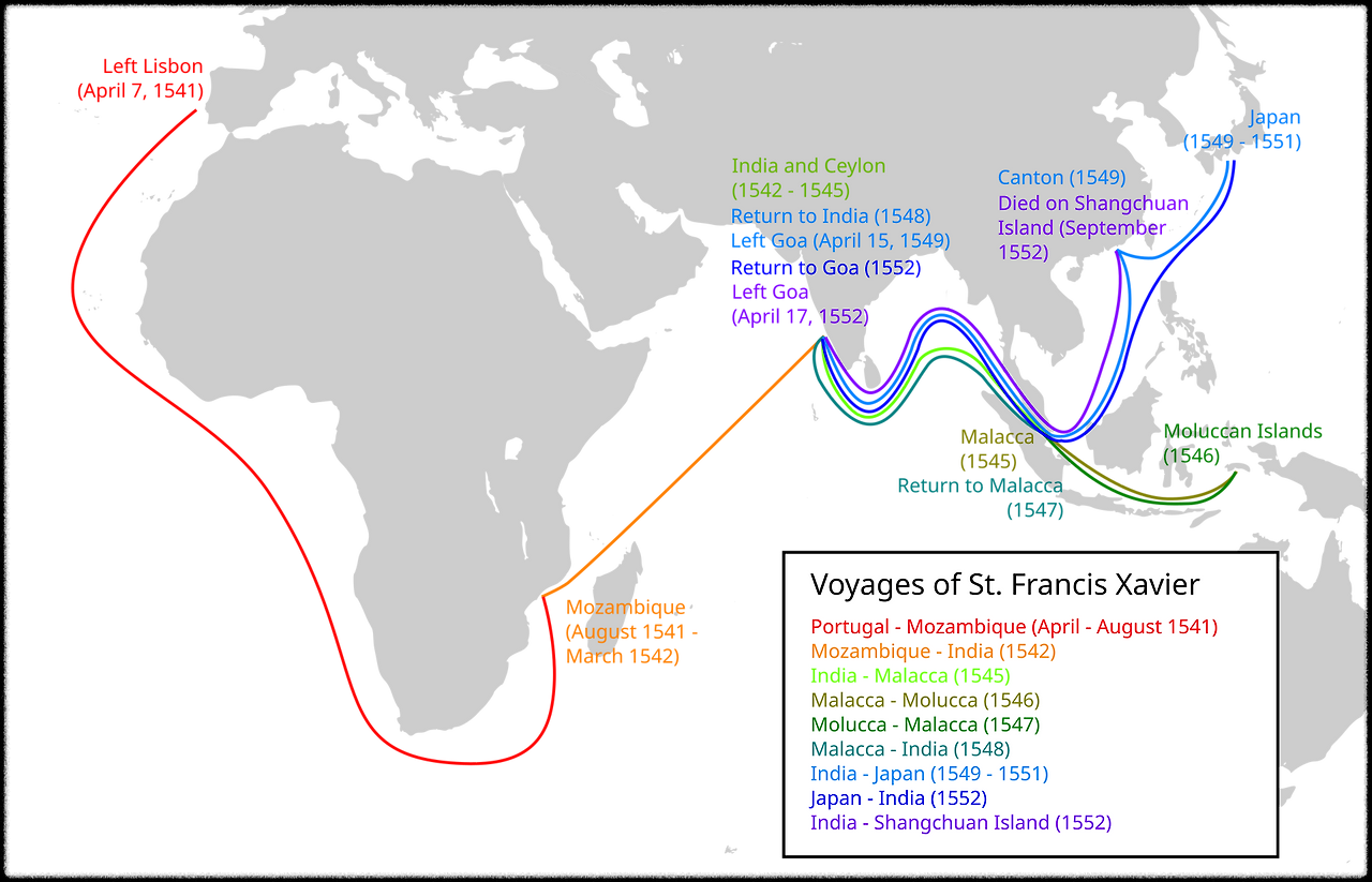 교황으로부터 인도의 교황대사 자격을 부여받은 하비에르는 1541년 4월 7일, 포르투갈의 리스본을 출발하여 희망봉을 돌아 13개월의 항해 끝에 인도의 고아(Goa)에 도착하였다. 고아는 1513년 이래 포르투갈이 점령하고 있었기 때문에 선교사들의 주요 활동 거점이 되고 있었다. 고아에 도착한 하비에르는 인도의 남부 지방, 말레이시아의 말라카, 뉴기니, 몰루카제도, 필리핀과 가까운 모로타이 섬을 찾아가 왕성한 선교 활동을 펼쳤다.