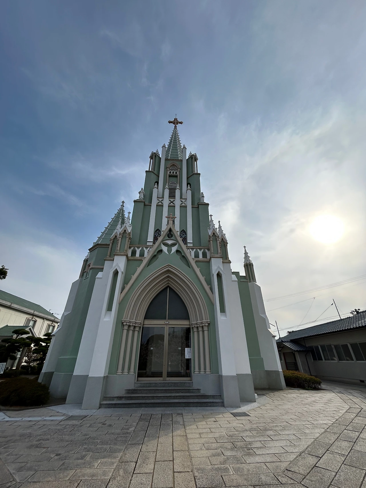 성당은 외부는 연두색으로 칠하고, 내부는 장밋빛의 기둥을 세워 따뜻하고 아름다운 인상을 주었다. 성당 주변을 요모조모 둘러보았더니 성당 왼쪽의 탑 하나가 없는, 그래서 오른쪽으로 약간 기운듯한 느낌이 나는 건물이라는 것을 발견하였다. 알고 보니 성당이 미완인 채로인 이유는 공사비가 부족하여 탑 하나를 마저 올리지 못하였기 때문이라고 하였다. 일본 내 가톨릭의 위세를 짐작하게 하여 약간 슬펐다.