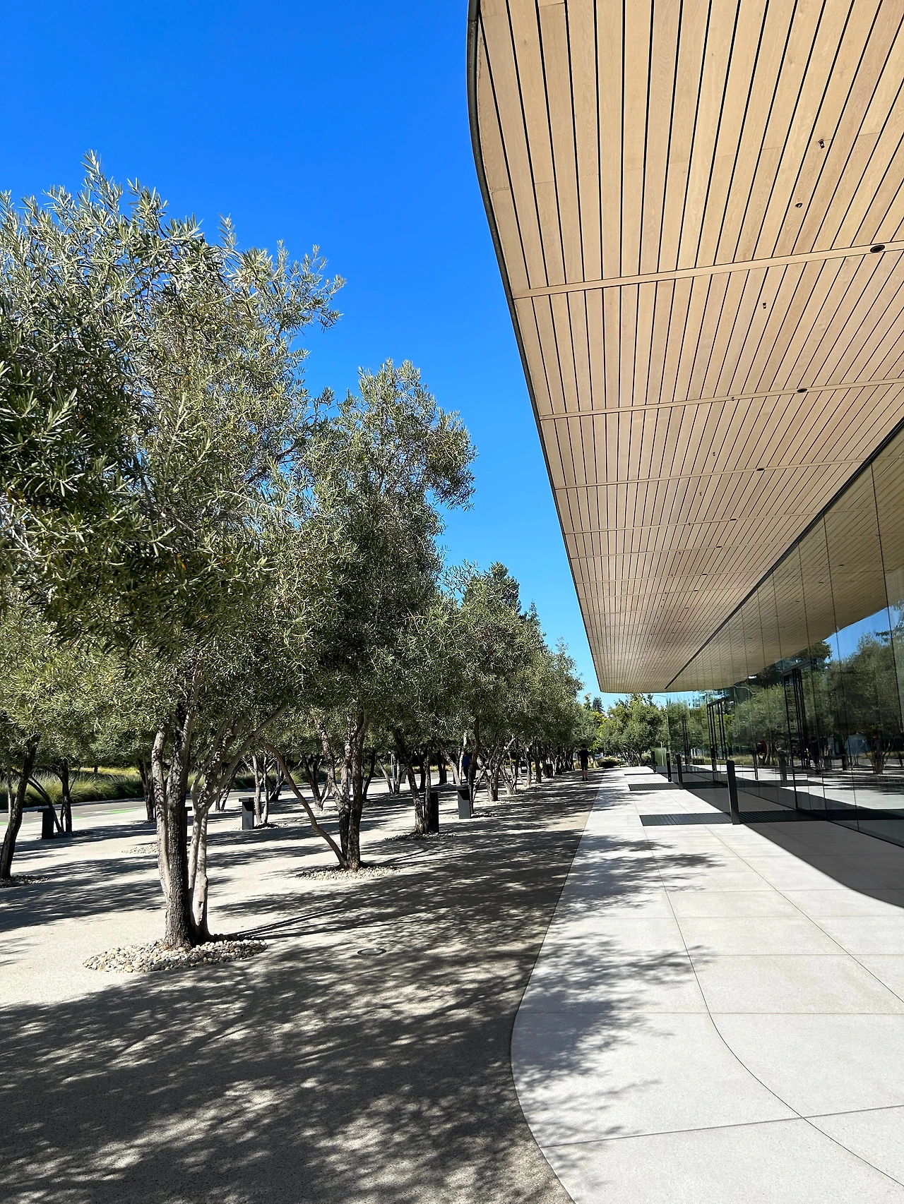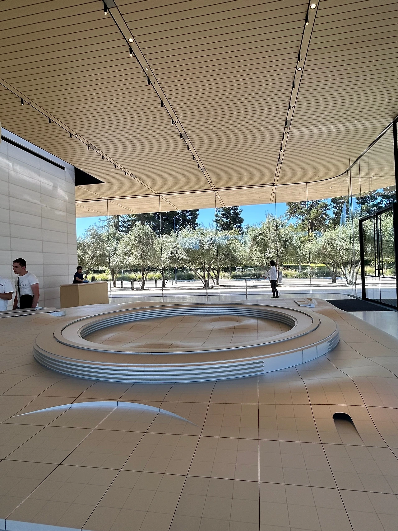 방문자센터 근처에는 올리브 나무가 가득 심겨 있었다. 왜 이곳에 올리브나무를 심었을까 잠시 의아했지만 이것이 팀쿡 회장의 친환경적 소신에서 나온 아이디어가 아닐까 하고 생각했다. 회사의 친환경적 분위기는 방문자센터 곳곳에서 느껴졌다. 건물에 목재를 많이 사용하였고 계단도 손잡이도 아이폰처럼 둥글게 마감처리되어 따뜻하고 고급스러운 분위기가 느껴졌다. 이 세계 최고의 기업은 이미지 관리에도 매우 신경 쓰고 있음이 틀림없었다. 멀리서 봐도 회사의 규모가 어마어마하게 보였다.