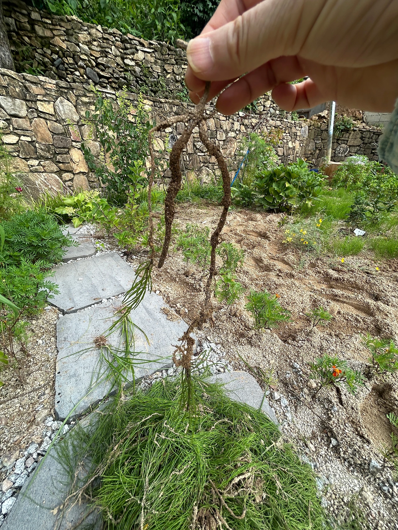나는 땅 속 깊이 번져있는 쇠뜨기풀을 제거하기 위하여 삽으로 땅을 깊이 팠다. 쇠뜨기들이 줄줄이 연결된 채 뽑혀 나왔다.
