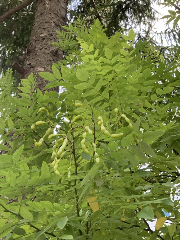 회화나무는 같은 콩과식물이어서 그런지 아카시 나무와 상당히 유사하게 보인다. 나뭇잎 모양이 꼬실하게 보이는 점, 하얀 꽃이 많이 달리는 점, 열매 꼬투리가 콩 꼬투리처럼 생긴 점 등이 서로 닮았다. 그런데 자세히 보면 회화나무는 꽃의 색이 연두색을 품은 미색이어서 눈에 덜 띄고 꽃 모양도 아카시나무 보다 훨씬 수수하다. 향기도 아카시보다 약하고 나무줄기에 가시도 없다. 무엇보다 아카시나무는 아무도 귀히 여기지 않지만 야생의 생명력으로 억척같이 번식하는 나무라면 회화나무는 인간의 사랑을 듬뿍 받고 자라는 나무라는 점이 다르다.