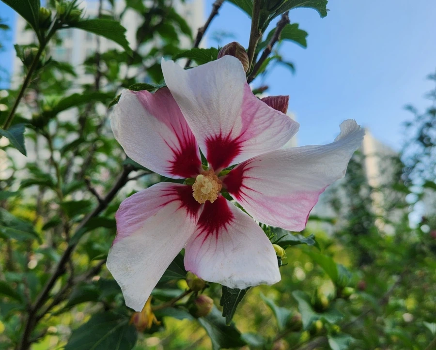 어릴 때 본 무궁화 꽃은 결코 아름답지 않았었다. 꽃 색깔도 청색이 많았고 예쁘지도 않은 꽃이 지치지도 않고 피었다. 무엇보다도 진딧물이 들끓었다. 그래서 가까이하기 싫은 꽃이 무궁화였다. 솔직히 나라꽃을 장미같이 화려하고 예쁜 것으로 정하지 않고 왜 저런 꽃으로 정했을까 하고 불만을 가진 적도 있었다. 그런데 지금 무궁화를 보면 진딧물은 간 곳 없고 꽃잎이 깨끗하고 청아하게 피어있는 모습이 예쁘기만 하다. 이제는 품종을 개량하여 진딧물이 들끓던 무궁화 종류는 더 이상 존재하지 않는다고 한다.
