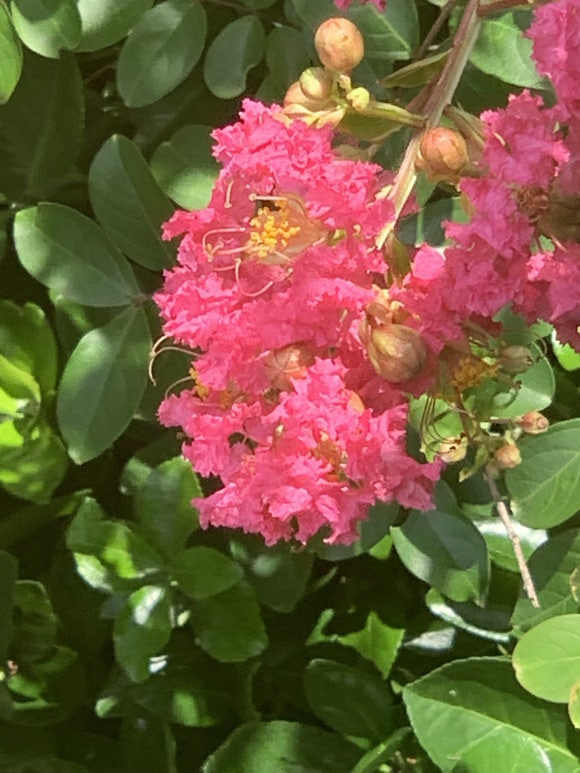 배롱나무를 자세히 보면 6~7장으로 이루어진 꽃잎에 모두 오글쪼글 주름이 잡혀 있다. 중앙에 노란 수술이 여러 개 모여 있으며 가장자리에는 6개의 수술이 유달리 길게 튀어나와 있다. 물론 암술도 있다. 이 꽃에는 볼 때마다 벌과 파리와 온갖 벌레들이 몰려와 있으니 화려한 자태에 덧붙여 꿀까지 풍족히 만들어 내는 것 같다.