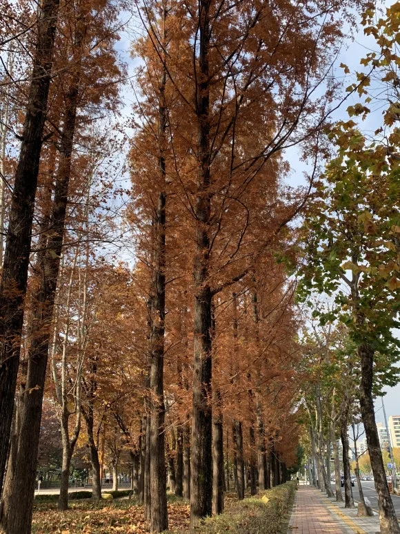 양재천에 가을이 들면 메타세쿼이아 가로수들이 빨갛게 물이 들어 완전 딴 세상을 연출한다. 가을이 되어 메타세쿼이어가 붉은 옷으로 갈아입고 환상적인 분위기를 만들어 내면 이때의 양재천 길을 드라이브하며 만추의 분위기를 느껴보려고 차들이 줄지어 이 길로 들어선다. 양재천에 줄지어 선 차들을 보노라면 사람들의 마음도 나와 다르지 않음을 느끼게 된다. 번잡한 도심 속에 살지만 우리 마음속에는 늘 자연의 아름다움을 희구하는 본능이 살아있음을 느끼게 된다. 아름다운 것은 아름다운 것이다.
