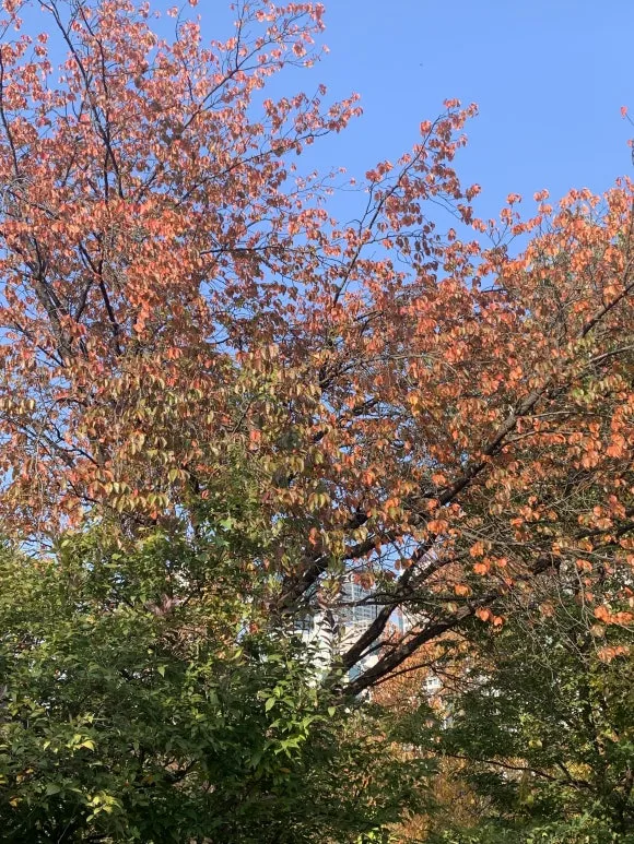 감은 참 유익한 식물이다. 맛있는 열매를 한껏 맺어주더니 단풍도 참 곱다. 감나무의 탄닌성분이 안토시안의 붉은색과 섞여 형언하기 어려운 부드러운 주황색을 연출한다. 잎이 넓어 그 존재가 더 잘 눈에 뜨이는 감나무 단풍이다.