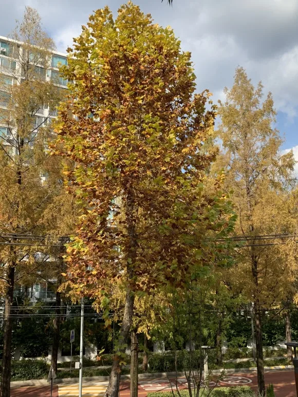 양버즘나무도 우아한 갈색으로 물이 드는 중이다. 갈색으로 물든 커다란 나뭇잎이 뚝뚝 떨어지면 쓸쓸한 가을 분위기를 만드는데 최고이다.