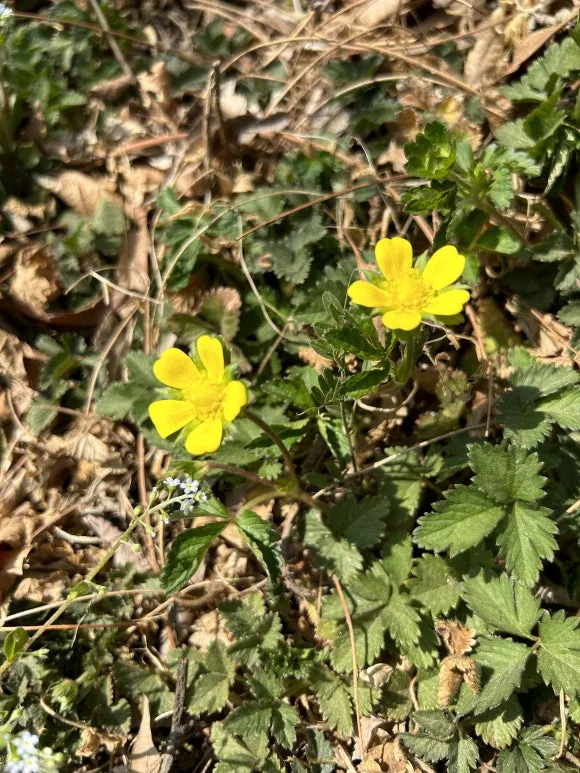 양지꽃과 똑 닮은 뱀딸기꽃도 피었다. 이 꽃은 양지꽃과 쉽게 구분이 가지 않을 정도로 비슷하게 생겼다. 뱀딸기 꽃이 지면 빨간 딸기가 열리는데 독이 없어 먹어도 된다고 한다. 이렇게 예쁜 식물에 뱀딸기라는 기이한 이름을 붙여 혐오감을 줄까? 꽃에게 미안한 일이다.