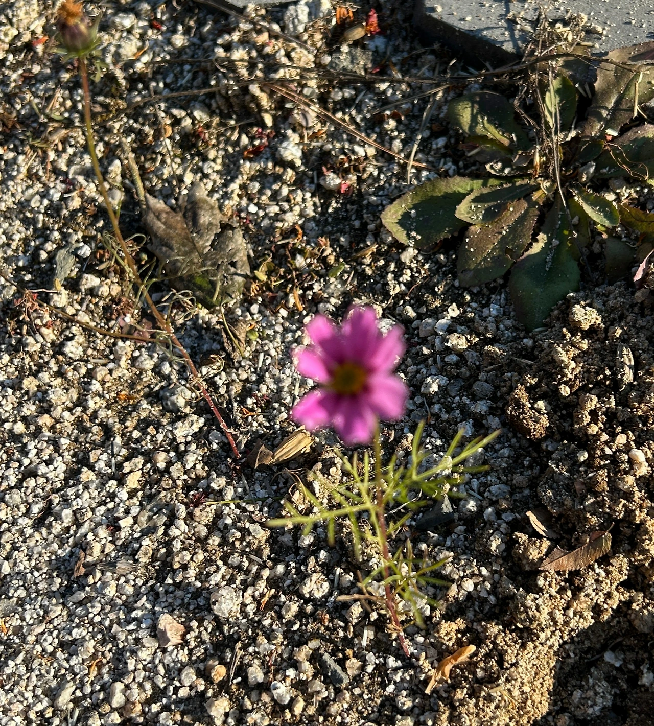 마른 식물 대를 다 제거하자 정원이 꽤 정리된 듯 보였다. 그제야 조금 한숨을 돌렸다. 그런데 마른풀 속에 숨어있던 작은 코스모스 꽃이 보였다. 아직도 나를 기다려준 그 작은 꽃에 울컥 감사한 마음이 들었다. 이제 겨울인데 인제 꽃을 피워서 어떡하냐 하는 걱정에 코스모스를 고이 쓰다듬어 주었다.
