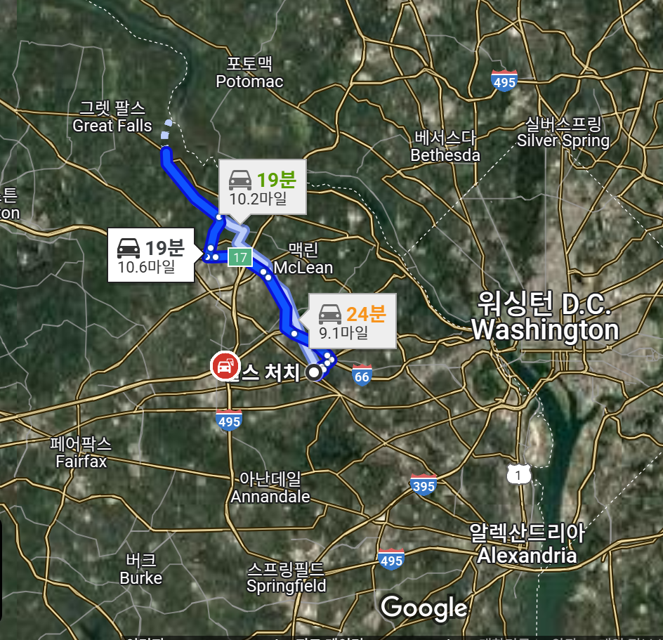 또 하나 친구가 좋아하는 드라이브 코스라고 하여 조지 워싱턴 메모리얼 파크 웨이(George Washington Memorial Park Way)로 몇 번 드라이브를 나갔다. 이 드라이브 길은 미국에서 네 개밖에 없는 ‘국가공원도로(National Park Way)’의 하나라고 하였다. 국가공원도로는 이름 그대로 국가에서 특별히 관리하는 도로라고 하니 얼마나 중요한 도로인지 알 수 있을 것이다. 이 도로는 북쪽으로는 Turky Run Park에서 시작하여 남쪽의 마운트 버논(Mount Vernon)까지의 약 25마일(40km)을 잇는 강변도로이다. 워싱턴 디씨를 바라보며 죠지 워싱턴 대통령의 생가가 있는 마운트 버논까지 연결되어 있어 이 도로는 미국 초대 대통령인 죠지 워싱턴 대통령을 기념하는 도로처럼 여겨졌다.