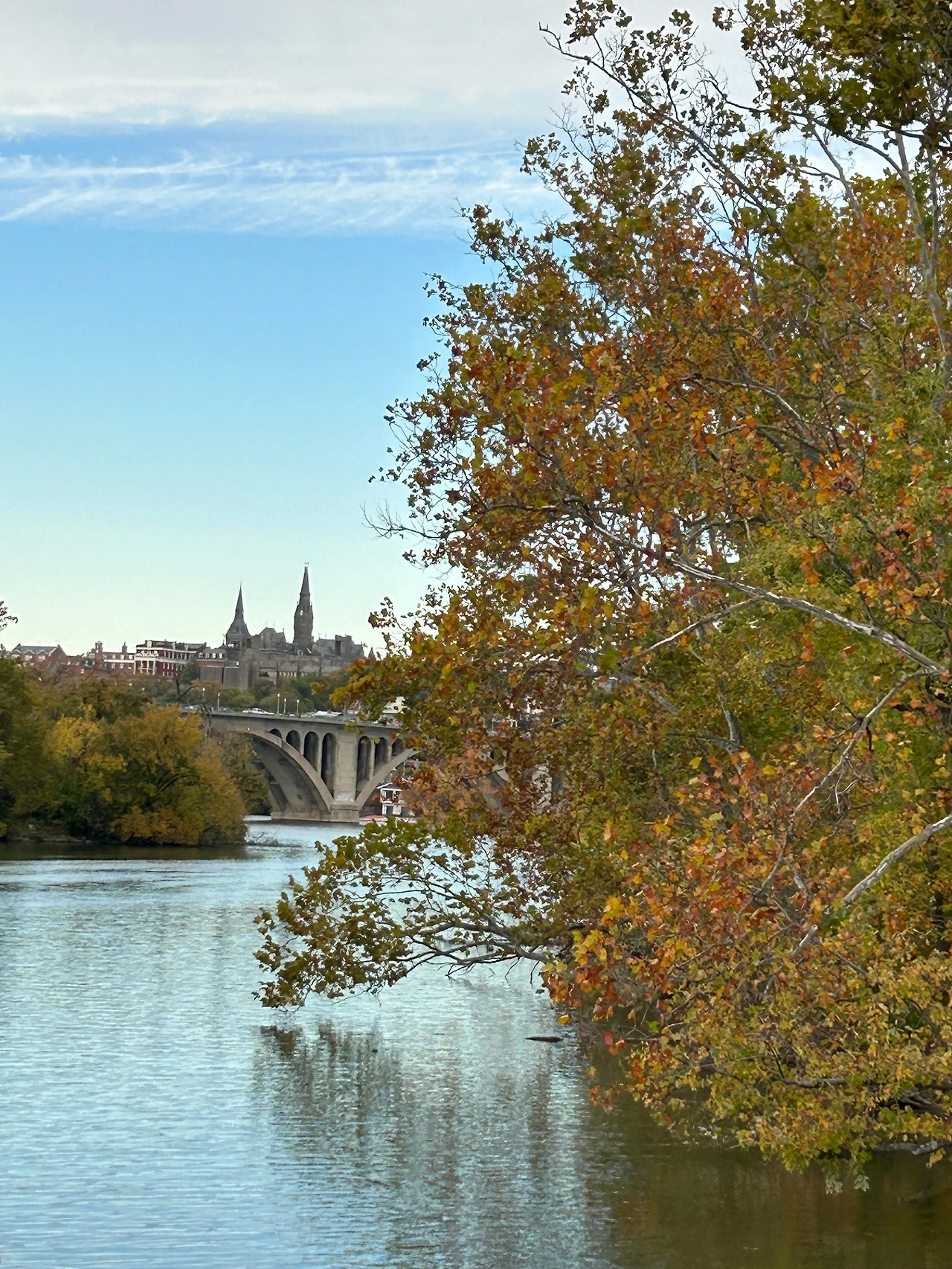 우리는 포토맥 강 한가운데에 있는 루스벨트 섬(Theodore Roosevelt Island)에도 갔었다. 저녁 무렵에 이곳에 도착하였는데, 강가 주차장에 차들이 즐비하여 이곳도 디씨 사람들의 사랑을 받는 장소임을 알 수 있었다. 포토맥 깅이 유유히 흐르고 강 건너편의 죠지 타운 마을이 한 폭의 그림처럼 아름답게 보였다. 자연히 과거 방문했던 죠지 타운 대학이 떠올랐다. 깨끗하고 아름답던 풍경으로 기억되고 있는 곳이다.