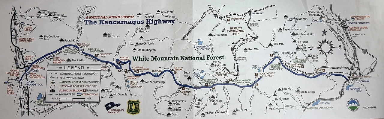 오후에는 화이트 마운틴의 전경을 돌아보는 The Kancamagus Highway로 드라이브를 하였다. 34.5마일(55.5km)의 이 드라이브 길은 화이트 마운틴 내셔날 포리스트를 가로지르며 달리는 뉴잉글랜드지역에서 가장 아름다운 단풍길로 유명하다. 그래서 National Scenic Byway로도 불린다.