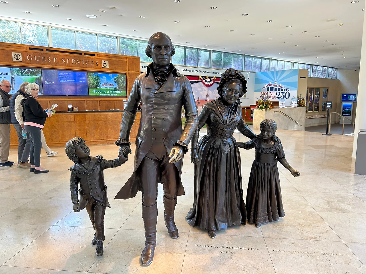 티켓팅을 위해 오리엔테이션 센터 안으로 들어서면 이들 가족이 마중이라도 나오는 듯 손을 잡고 우리를 맞아준다. 이 가족 동상은 조지 워싱턴과 그의 아내 마사 워싱턴, 그리고 마사의 손자녀들인 넬리 커스티스(Nelly Custis, 오른쪽)와 조지 워싱턴 파크 커스티스(George Washington Parke Custis, 왼쪽)를 형상하고 있다. 마사의 손자인 조지 워싱턴 파크 커스티스는 훗날 알링턴 국립묘지 내 알링턴 하우스(Arligton House)를 지어 워싱턴을 기리는 유산을 이어갔고 그의 딸인 메리 A.R. 커스티스(Mary Anna Randolph Custis)는 남북전쟁의 또 다른 영웅 로버트 E. 리(남부군 총사령관)와 결혼하여 남북전쟁의 또 다른 연결점이 된다.