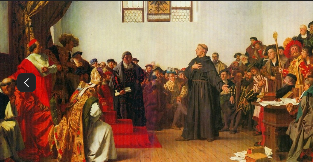 안톤 폰 베르너의 ‘보름스 회의의 마르틴 루터’(1877년). 종교개혁을 주도한 루터는 타락한 가톨릭교의 상징이었던 빨간색을 혐오해 개신교도들은 검은 옷을 입어야 한다고 주장했다. by <문명을 담은 팔레트>