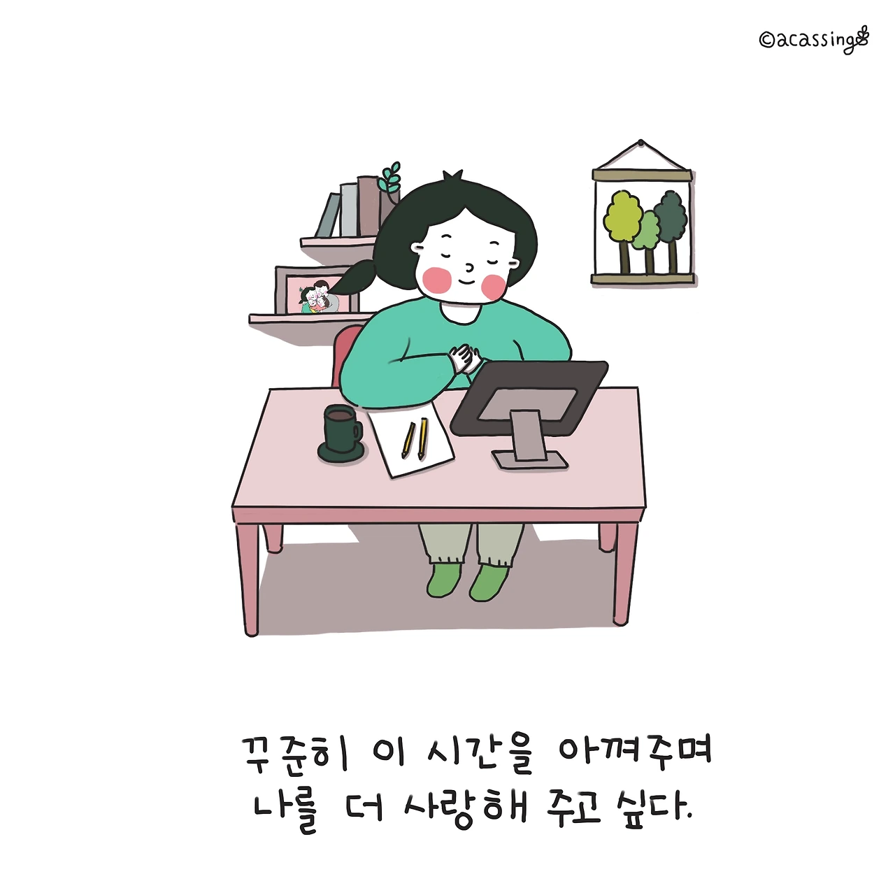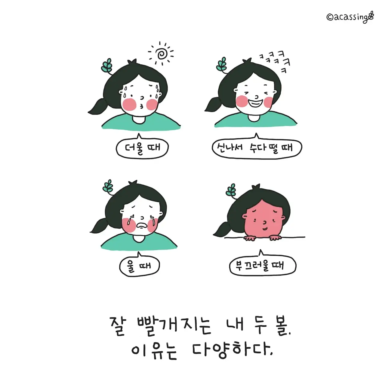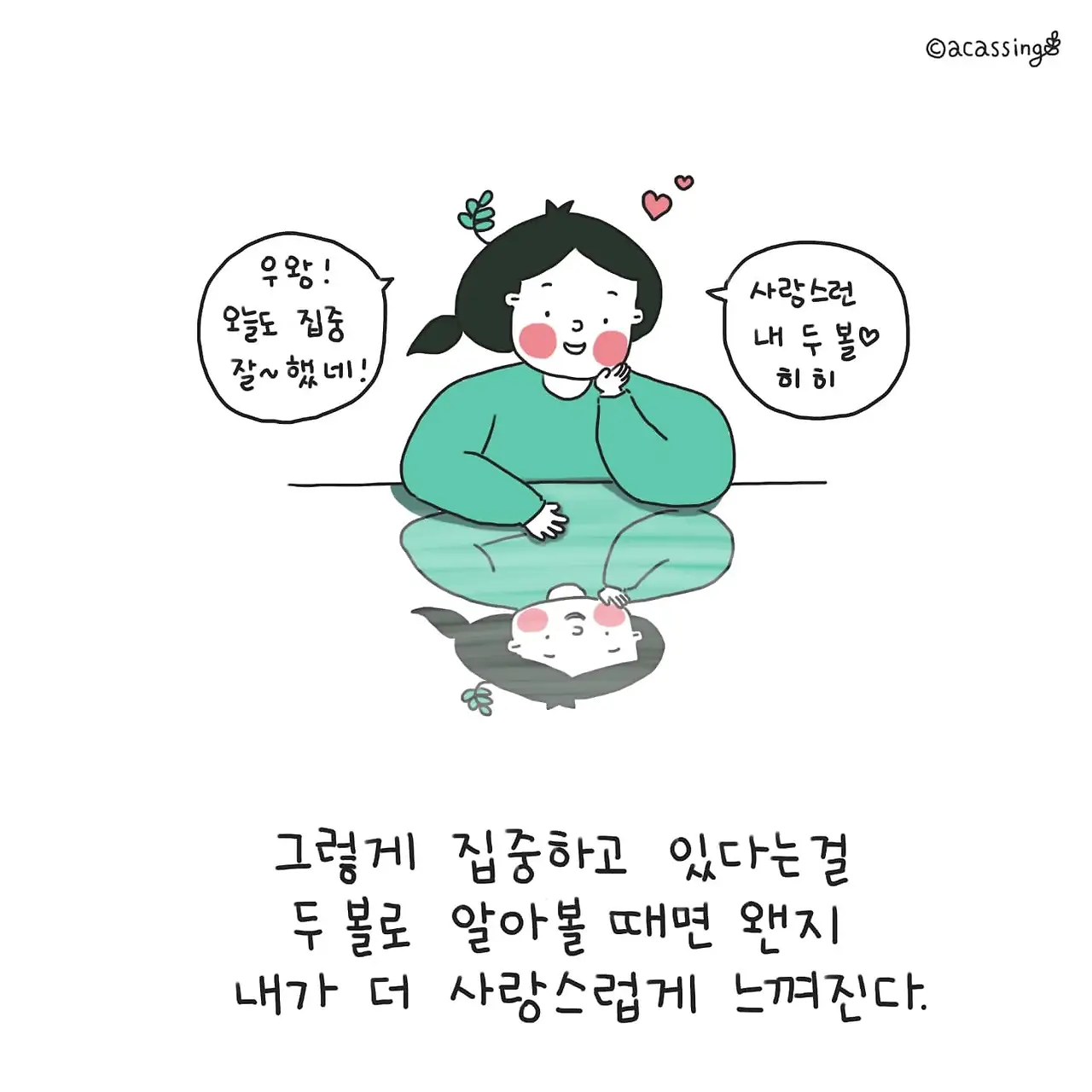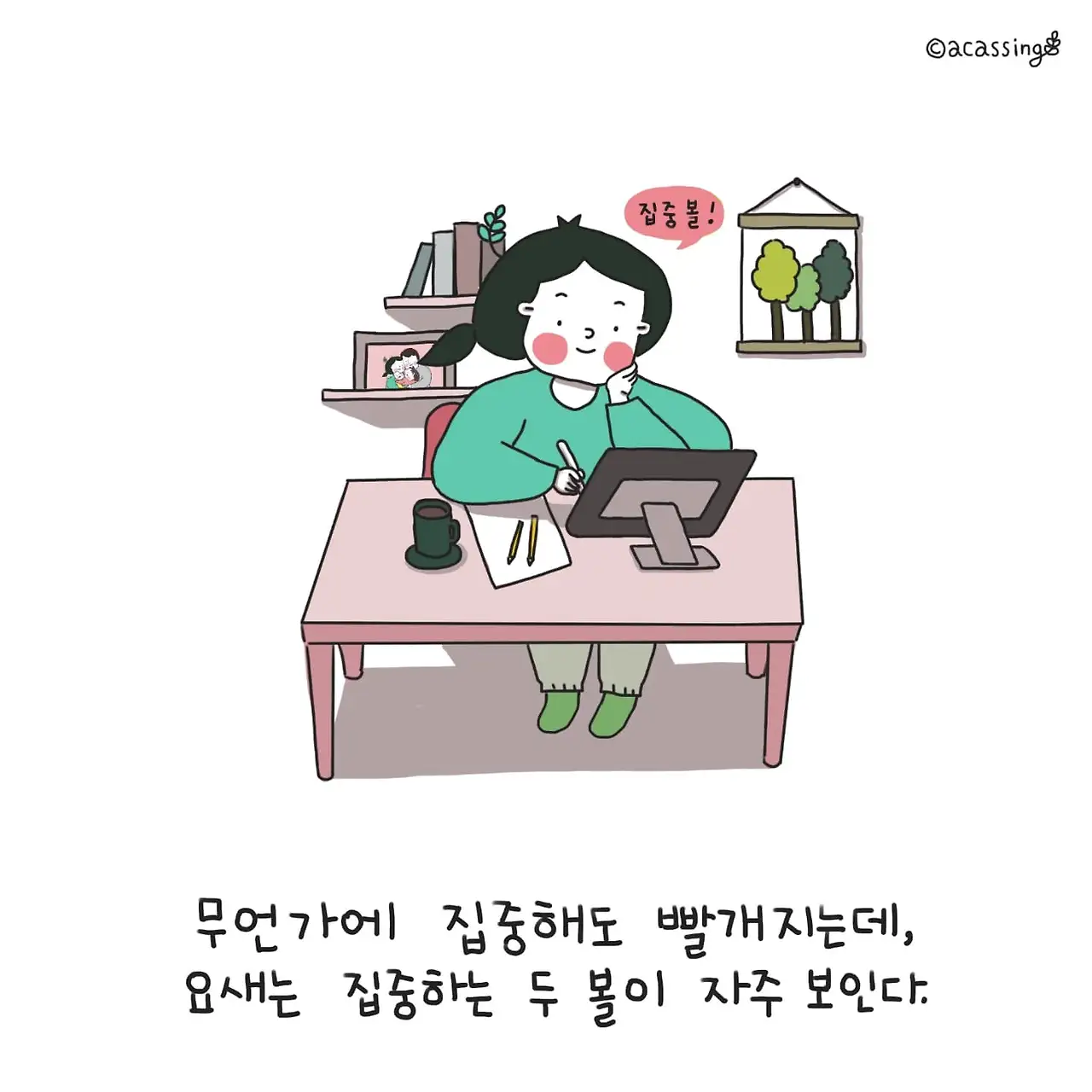 아이들을 재우고 평온히 그림을 그리고 있던 나를 보며 남편이 묻는다. 아 맞다. 나 집중하면 빨개졌었지! 집중하면 빨개지곤 하던 내 볼이 아주 오랜만에 얼굴을 내밀더니, 이제는 자주 얼굴을 비춘다. 예전에는 붉어지는 얼굴이 그렇게나 싫었는데 요즘은 참 좋다. 내가 집중하고 있다는 것이 기쁘고 대견하고 또 사랑스럽기까지 하다.