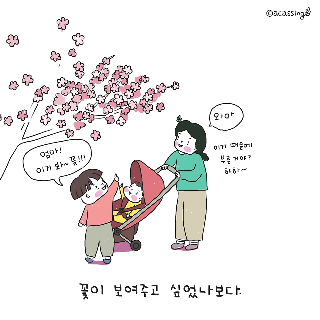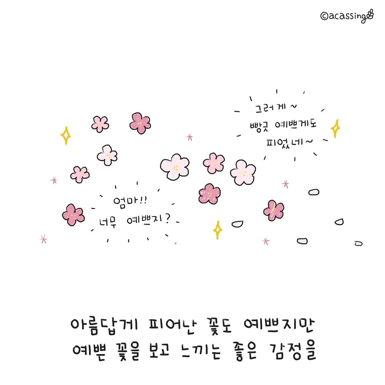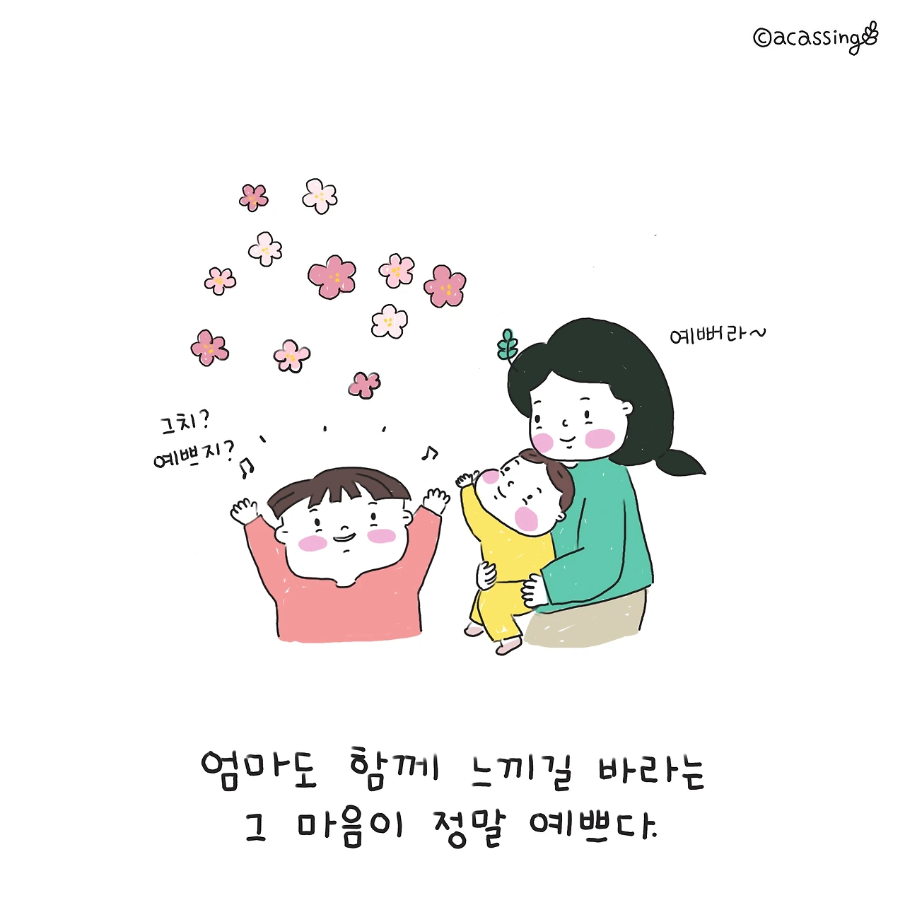 봄을 알리는 예쁜 꽃들이 하나둘씩 피어나는 요즘. 찰랑이는 봄으로 가득 찬 이 세상이 들뜨고 신기하고 또 기쁜가 보다. 덩달아 나도 신이 나면서 또 잠잠해지는 건 찰랑이의 마음이 느껴지기 때문이다. 봄이 가져다준 생기 있는 감정을 어떻게든 엄마에게 알려주고 또 함께 느끼고픈 아이의 마음. 봄도 꽃도 예쁘지만 아이의 마음이 정말 예쁘다.