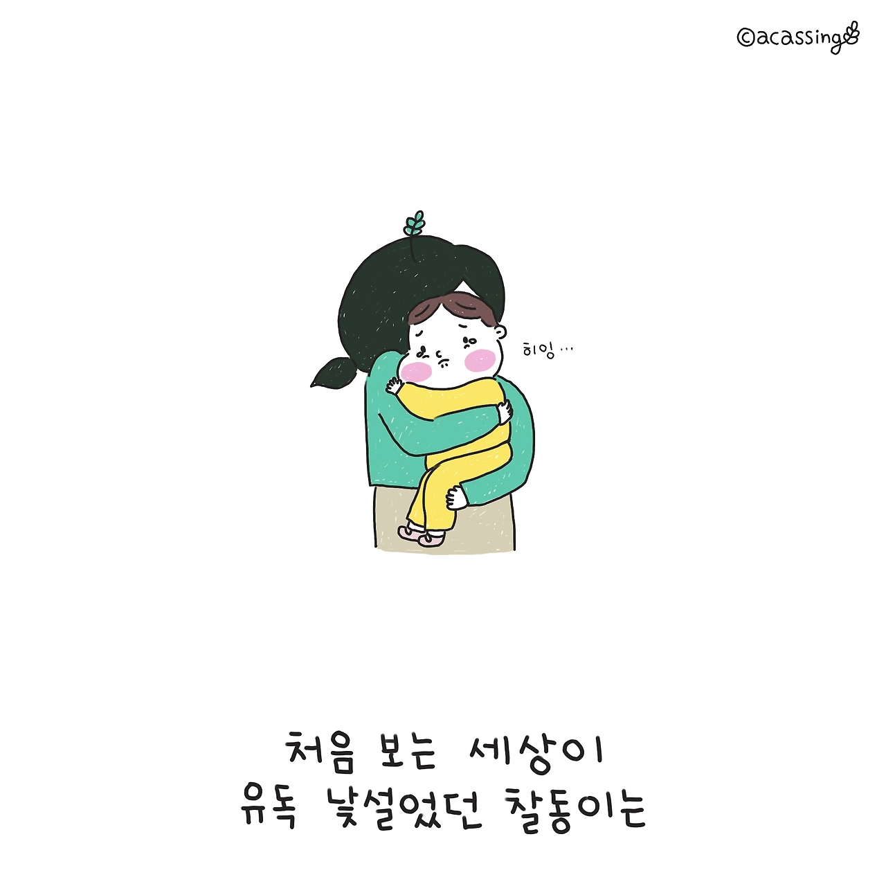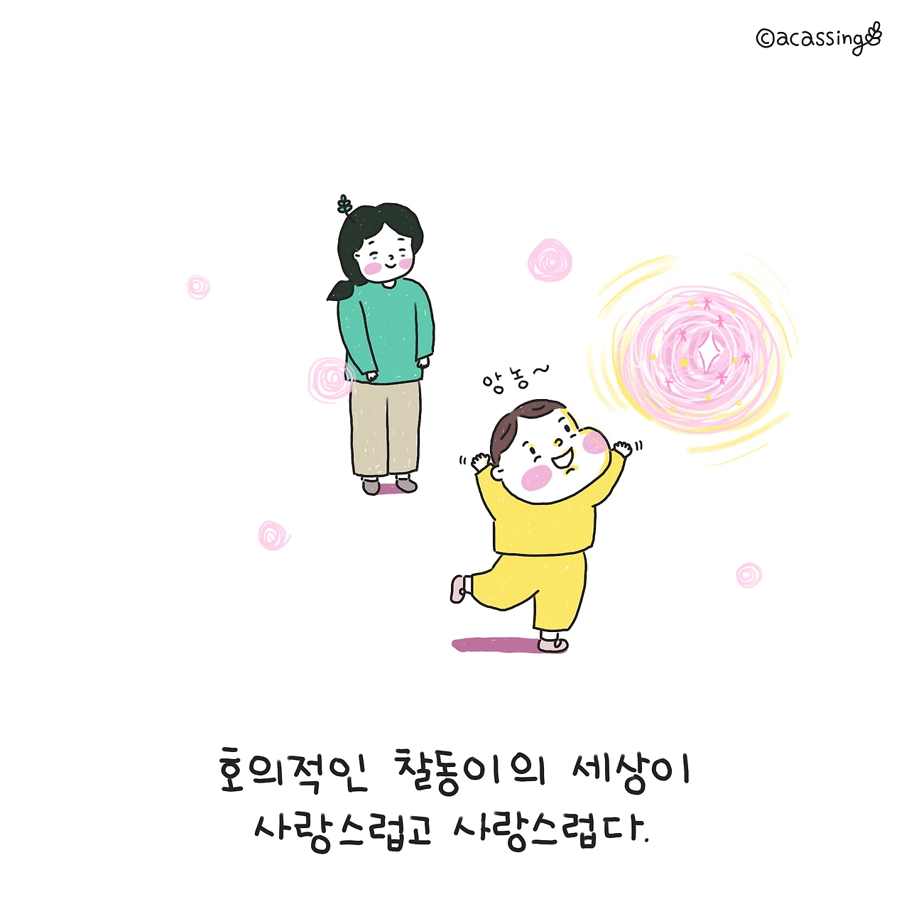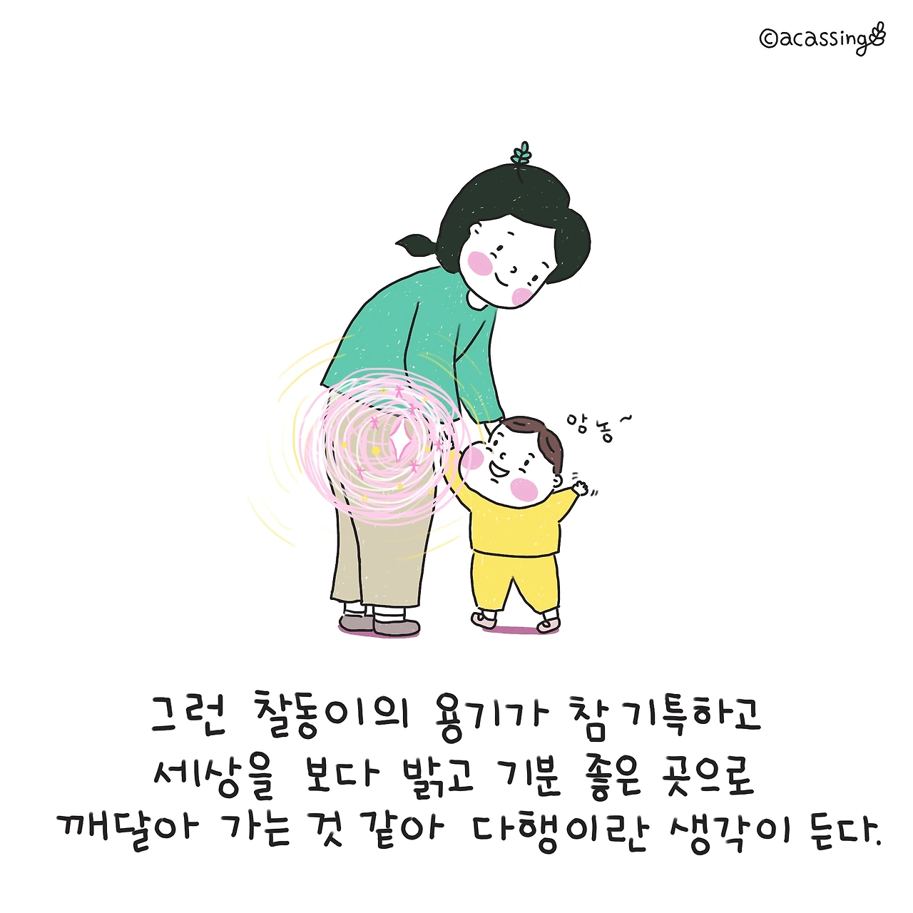 그렇게 보면 경험이란 게 참 중요한 것 같다. 우연히 얻은 작은 경험일지라도 그것들이 잦게 쌓이다 보면 엄청난 힘을 발휘한다. 찰동이처럼 세상이 낯설고 무서운 아이에게 먼저 인사한다는건결코 작은 것이 아니다. 엄청난 힘이고 용기다. 이 힘을 불어넣어 준 작고 소중한 경험들이 훗날 찰동이에게 더할 수 없는 용기를 줄 것이라 믿는다.