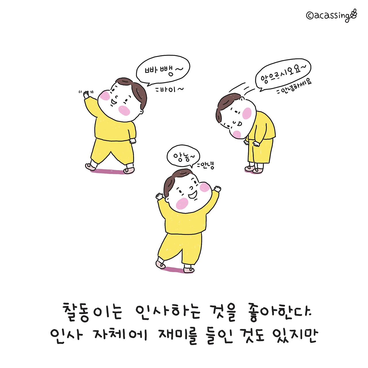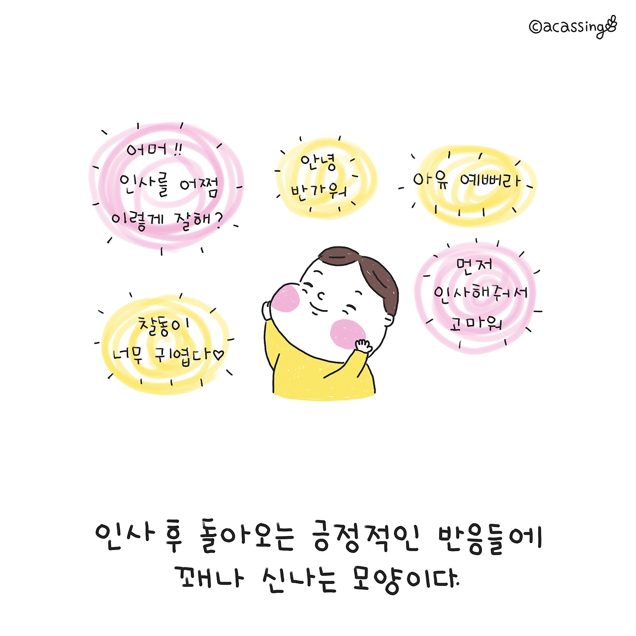이건 무엇일까 곰곰이 생각해 보니, 인사를 하고 나서의 좋은 반응들이 찰동이에게 어떤 하나의 힘을 불어넣어 준 것 같다. 처음엔 엄마가 또는 형이 인사를 하니까 얼떨결에 따라 했을 것이다. 그런데 그때그때 받았던 낯선 이들의 기분 좋은 피드백이 좋았고 찰동이 안에 생긴 작은 힘이 인사를 잘하게 한 것. 사실 인사만 잘해도 예쁨 받을 자격이 충분한 게 아이들인데 찰동이는 그 예쁨 받는 법을 제대로 알고 간파해 버렸다.