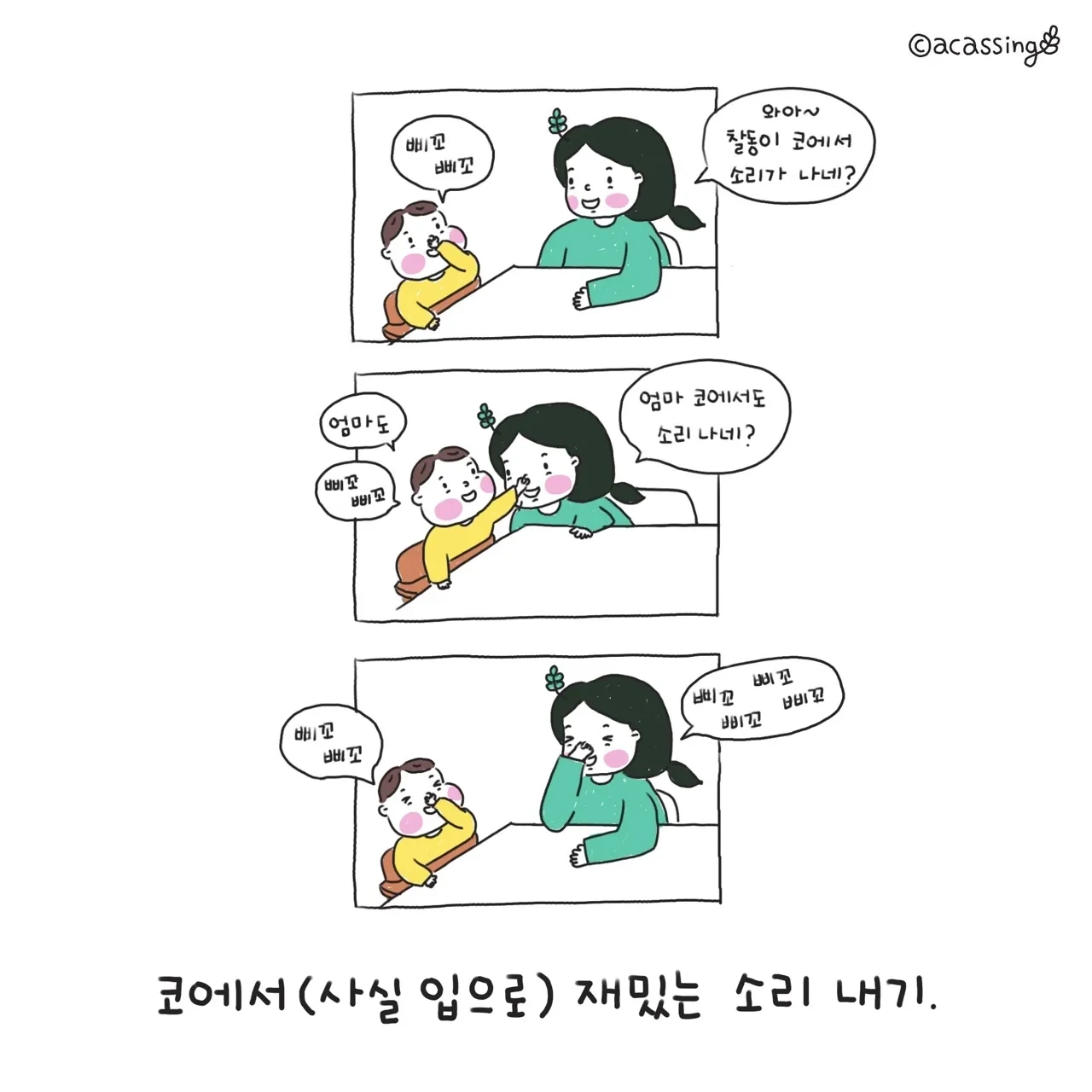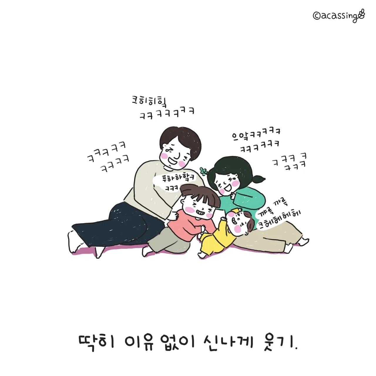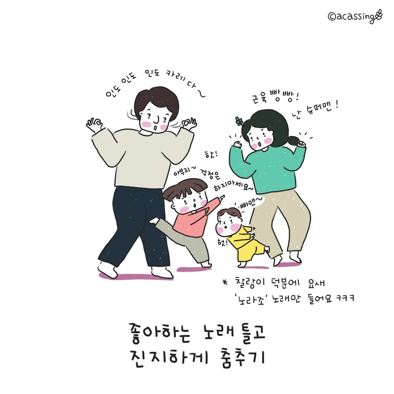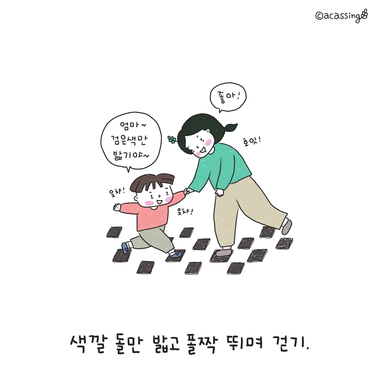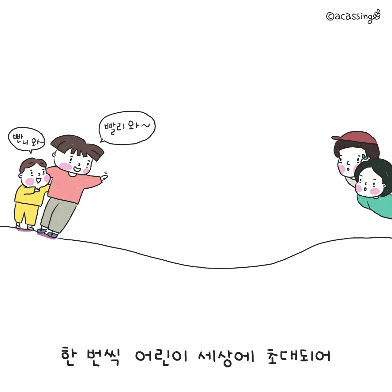 "엄마 내 표정 좀 봐봐~" 오늘도 어김없이 찰랑이가 얼굴 근육에 잔뜩 힘을 주고 입을 씰룩거리기에, 지지 않고 괴기스러운 소리까지 내며 요상한 표정으로 맞장구쳤다. 그게 뭐라고 뒤로 넘어가 낄낄거리는 어린이 모습에 나 또한 웃음이 터진다. 매일 몇 번씩 초대되는 어린이의 세상은 코 끝 간지럽게 즐겁다. 어린이건 한때 어린이였건 즐거움 하나로 똘똘 뭉칠 수 있는 어린이의 세상. 오늘도 그들의 세상에 어깨동무하며 정답게 들어가 본다. 그렇게 즐거운 어린이가 되어본다.