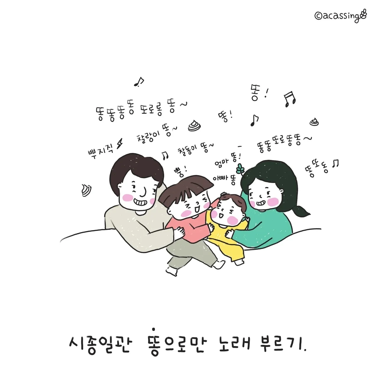 아이들의 세상은 단순하면서도 또 다양하기도 하고 이해가 안 되면서도 웃음을 유발하는 묘한 이야기가 담겨있다. 길을 걷다 색깔 블록만 밟는 나름의 규칙을 제안하고, 하루종일 말 끝에 똥을 붙인다. 또 신나는 노래에 맞춰 춤을 진지하게 추고는 어느 한순간에 터져버리는 웃음. 처음엔 엥? 이해가 안 되지만 어느새 그들의 세상에 자연스레 초대되어 놀고 있는 나를 발견한다. 그러면서 아! 맞아, 나도 한때 어린이였지. 나도 어린이일 때 이렇게 놀았었지 끄덕인다.