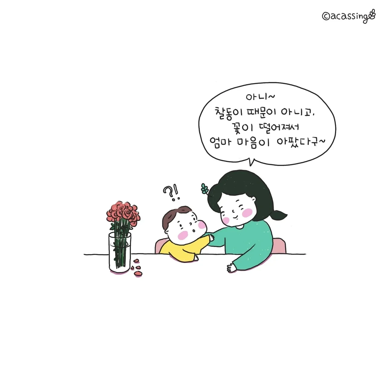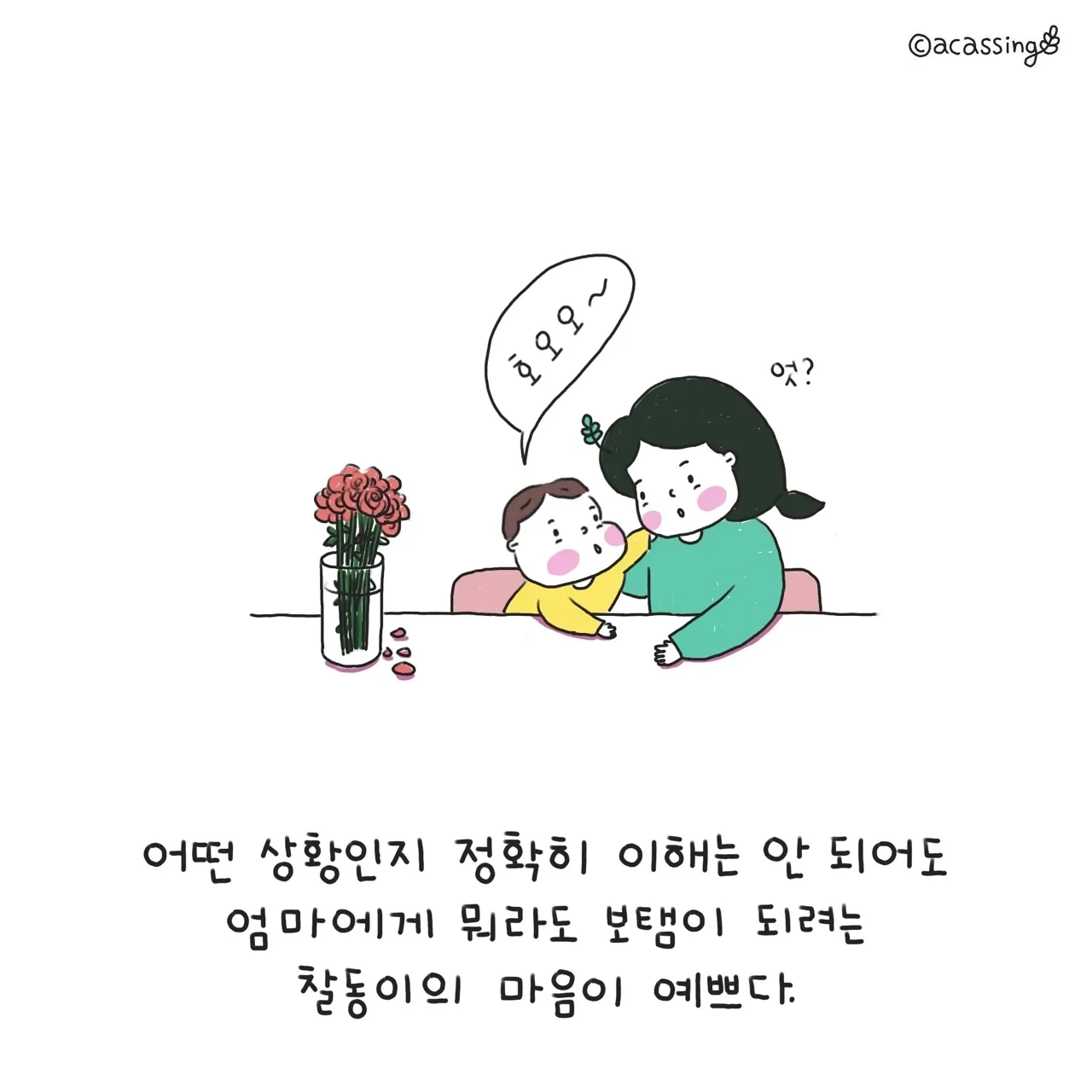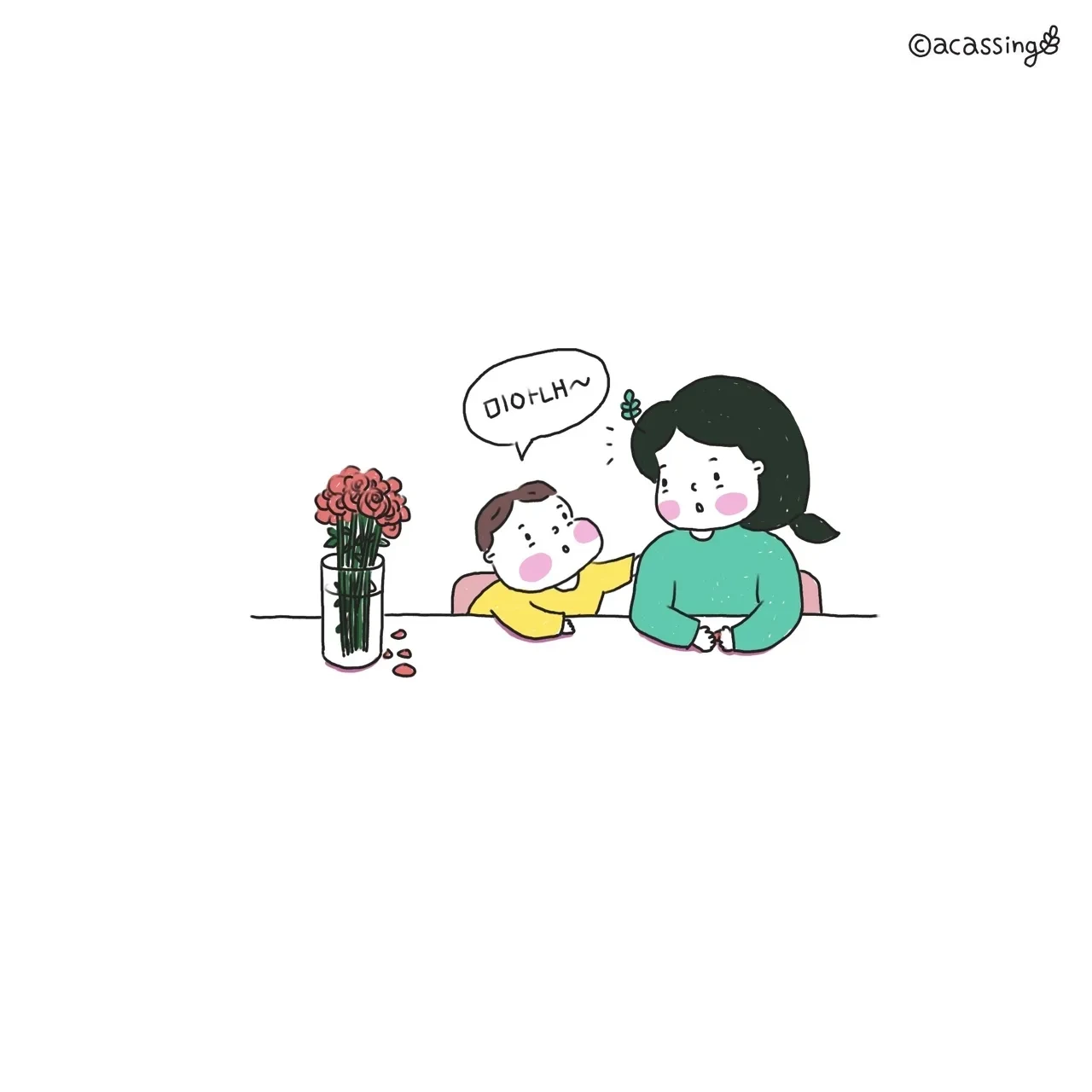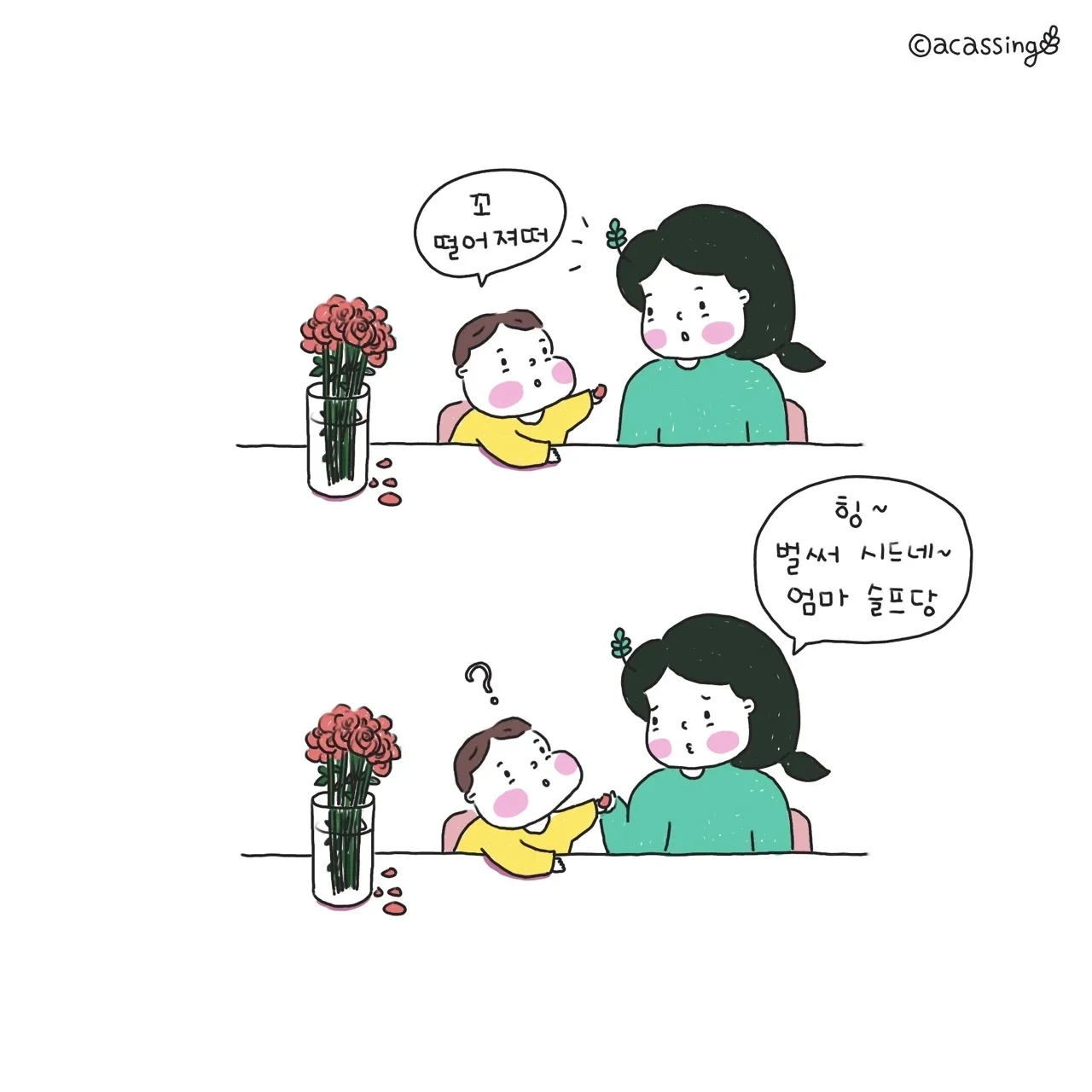 보통 꽃을 사서 물에 담가두면 1주 이상은 거뜬히 생생한데, 어쩐지 이번에 산 분홍색 장미는 순식간에 시들해지더니 삼일도 안되어 꽃잎이 우수수 떨어졌다. 떨어진 꽃잎을 줍는 속상한 마음을 찰동이가 눈치챘나 보다. 정확히는 알 수 없지만 꽃이 떨어지고 엄마가 속상해하는 마음을 읽어낸 아이. 제 딴에 해볼 수 있는 작은 도움과 위로를 꼬물꼬물 건넨다. 미안해~, 호~ 그 작은 두 마디에 찡그렸던 마음이 사르르 녹아내린다.