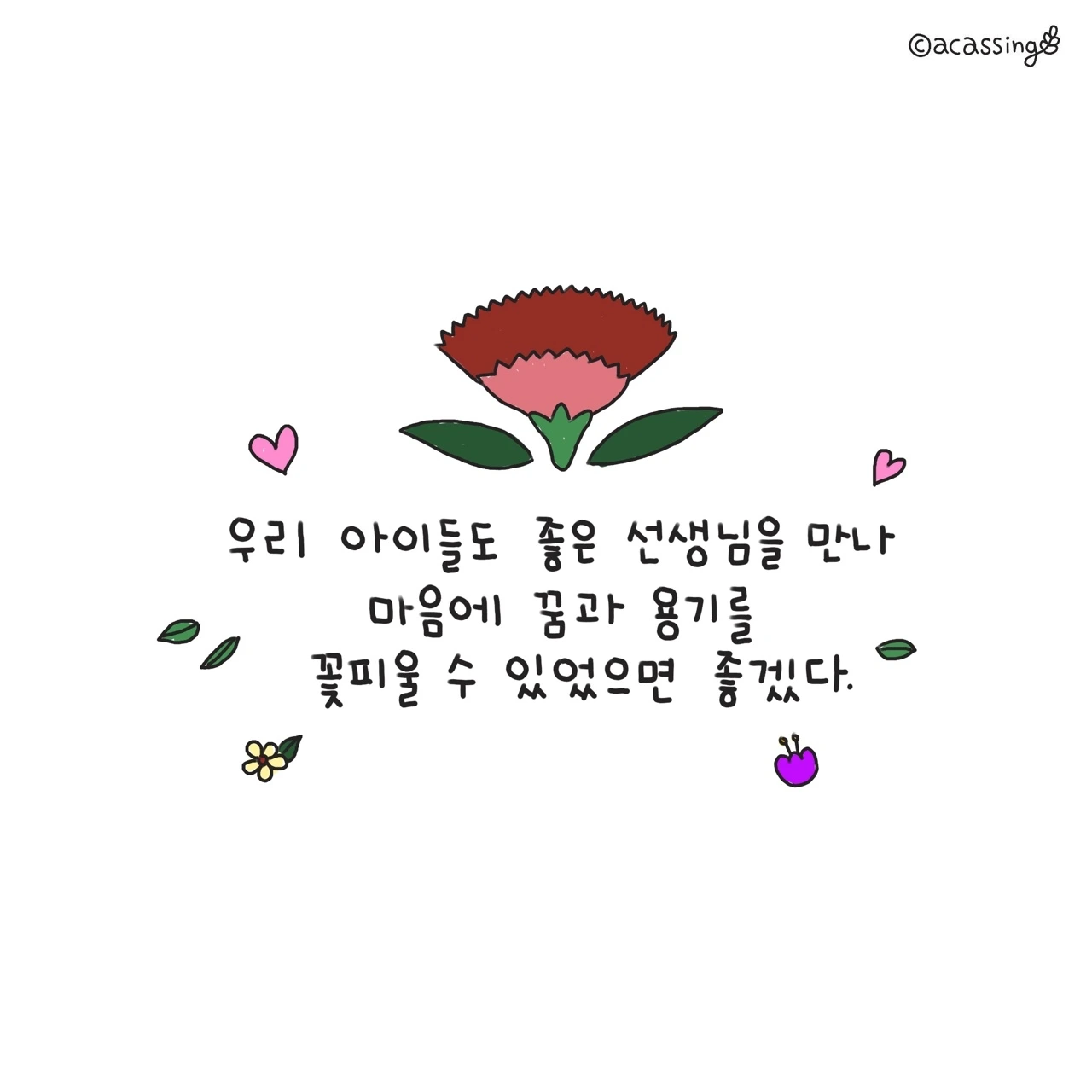 아이들을 안고 기도해 줄 때 잊지 않는 것 중 하나가 '만남의 축복'이다. 우리 아이들에게 좋은 길을 인도하고 함께해 줄 사람들이 함께하길 말이다. 우리 아이들도 마음에 힘과 용기를 꽃피울 수 있게 도와줄 좋은 선생님이 곁에 계셨으면 좋겠다. 나에게 좋은 선생님이 축복으로 깃들었던 것처럼. 더불어 그 가르침과 인도함 속에 피어난 감사를 마음속에 따뜻하게 품을 줄 아는 아이가 되길 바라본다.