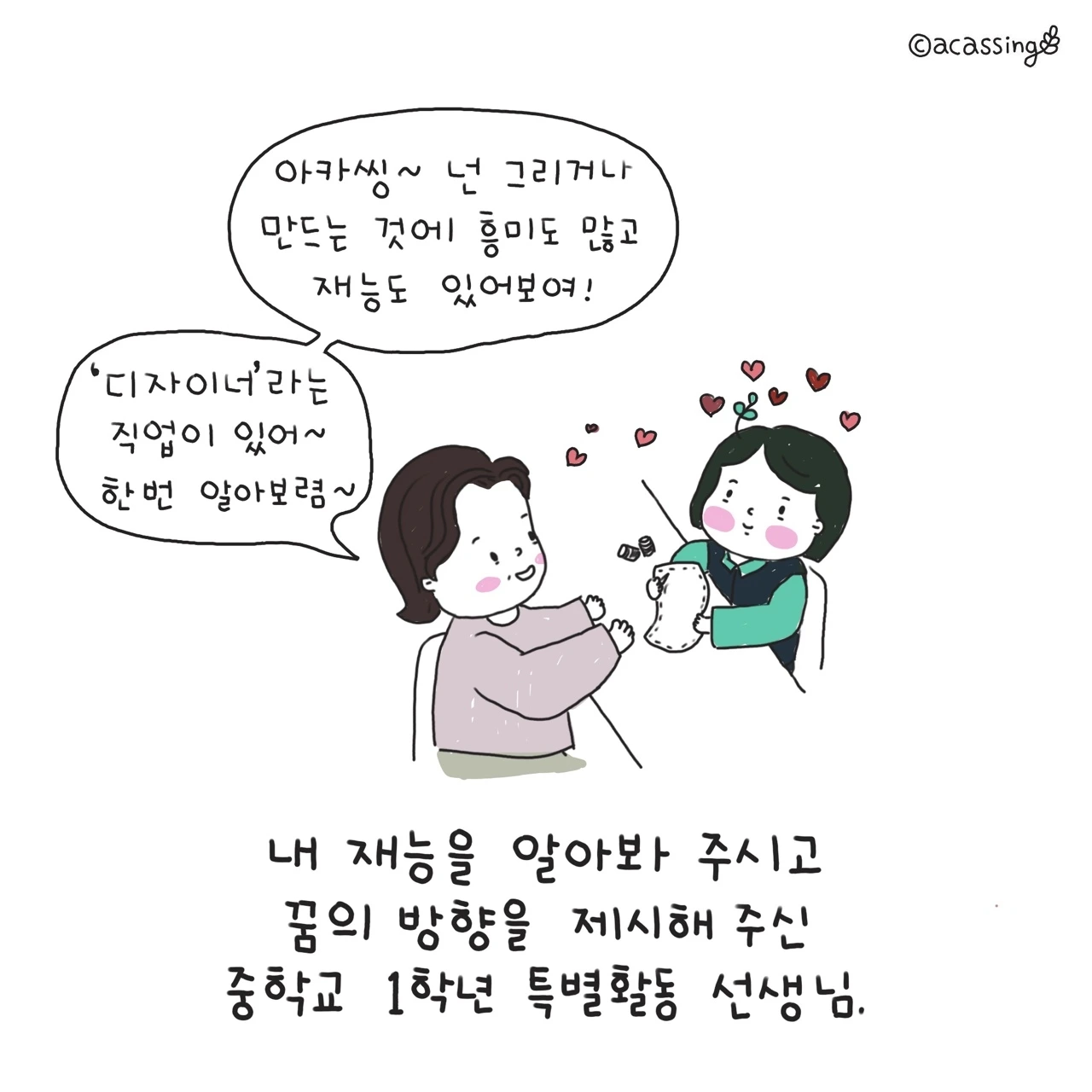 난 늘 나의 미래가 궁금하고 또 중요하게 생각하는 아이였다. 아주 어릴 때부터 난 커서 뭐가 될까? 난 뭘 잘하고 또 행복할 수 있을까? 먼 미래의 나를 수시로 탐구하는 그런 아이였다. 그런 내게 선생님의 발언은 실로 엄청난 것이었다. 그림 그리는 게 좋았던 건 사실이지만, 그림을 그리는 직업은 (그 당시 내 지식 안에서는) '화가' 뿐이라 생각했다. 나의 미래를 그려볼 때 그림을 그리는 화가라는 것은 좋긴 한데 이상하게도 중요한 무언가가 쏙 빠진 찝찝하고 불만족스러운 느낌이었다. 그런데 디자이너라니? 그동안의 의문들이 풀리고 뭔가 그럴싸하게 완성되는 느낌이다! 선생님이 봐준 나의 흥미와 재능을 디자이너라는 직업이 완성시켜 줄 것 같다는 확신이 들었다. 한 여름, 그 열기보다 더한 선생님의 그 뜨거운 이야기를 듣고 도서관에서 디자이너에 관한 책들을 읽었다. 그때 더 확신했던 것 같다. 그래, 디자이너가 되어보자. 오늘부터 내 꿈은 디자이너야!