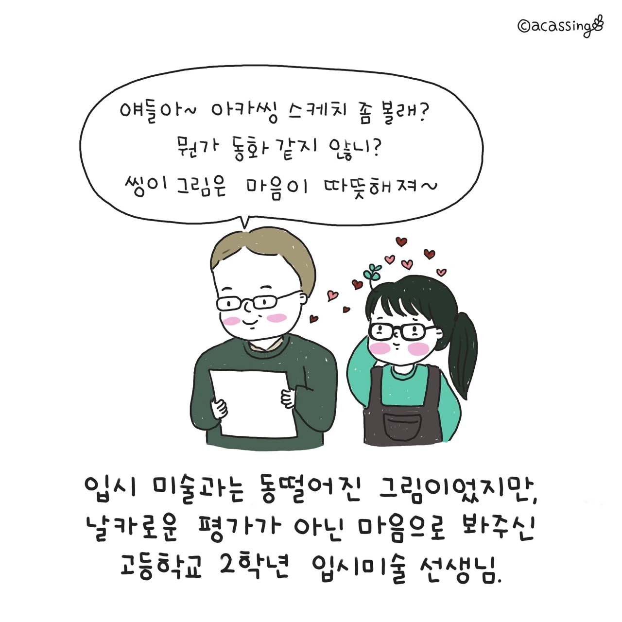 그렇게 한참을 감상하시는 선생님. 그 눈빛이 잊히지 않는다. 내 그림을 날카로운 평가가 아닌 따뜻한 마음의 눈으로 봐주신 선생님의 한마디에 눈물이 날 것 같았다. 그러면서 시름시름 괴로웠던 마음에 알 수 없는 용기가 꼬물꼬물 피어났다. 그 용기란 힘은 나에게 속삭였다. 아, 난 따뜻한 그림을 그릴 수 있는 사람이구나!