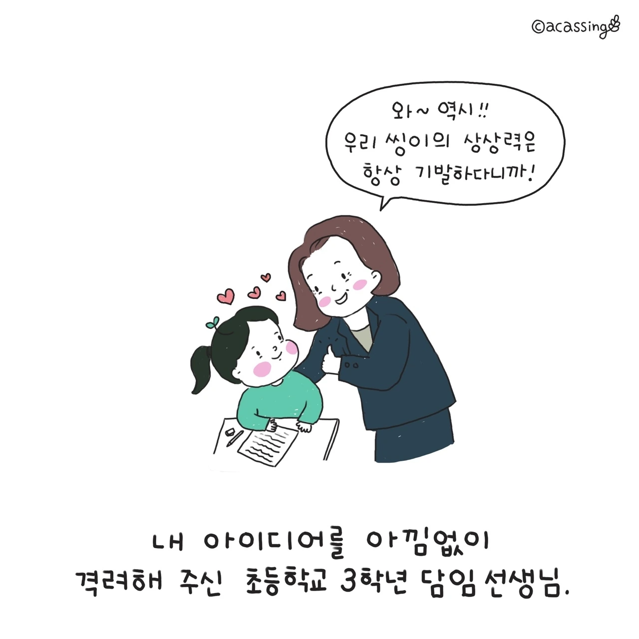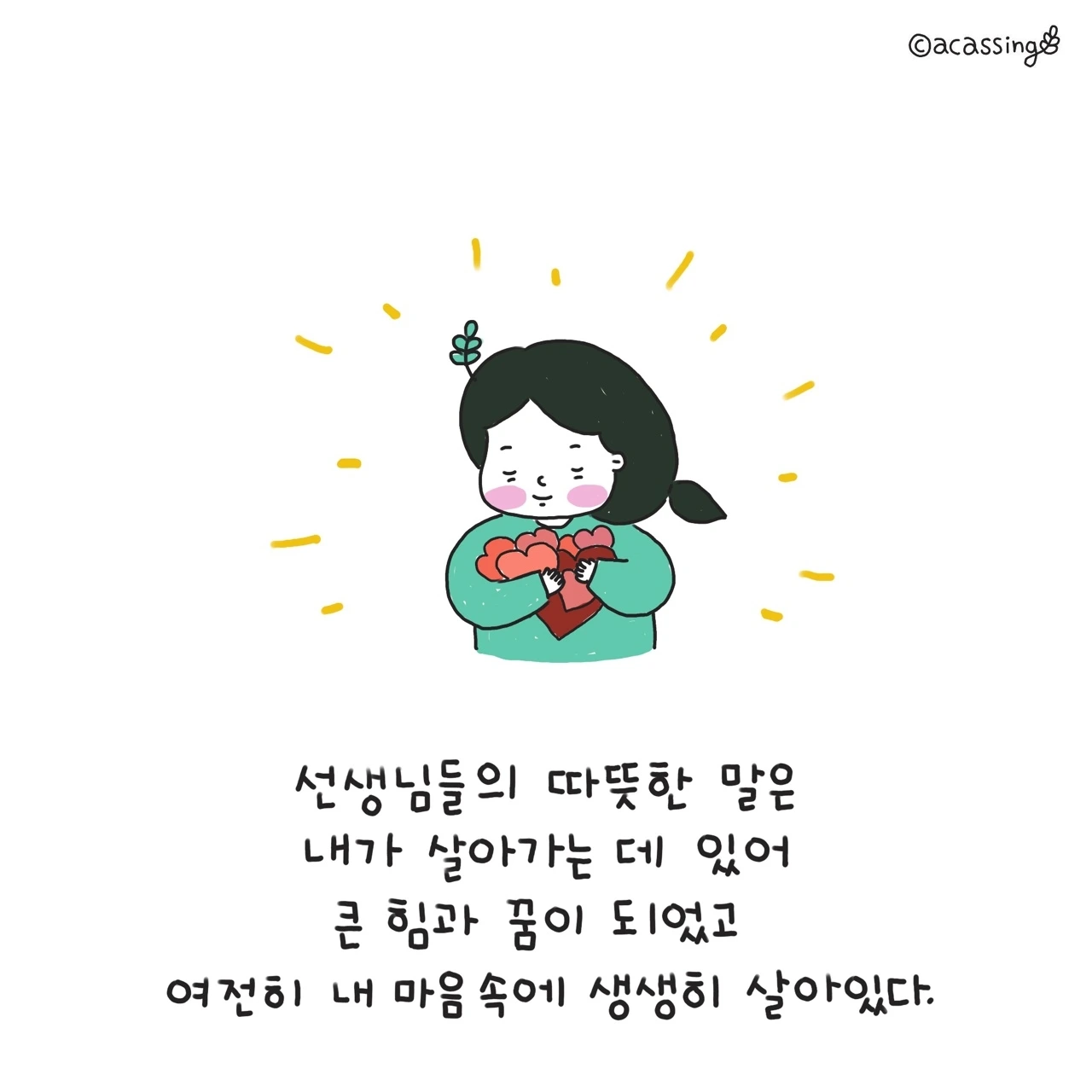 어릴 적 내게 있어 선생님은 참 큰 존재였다. 엄마 아빠가 아닌 나에게 가르침을 줄 또 다른 사람. 선생님은 그 자체로 믿고 존경할 사람이라 생각했다. 좋은 가르침을 줄 사람이라는 믿음 때문인지, 작은 말이라도 선생님의 말은 왠지 쿡 박혔다. 참 운이 좋게도 난 시시 때때 좋은 선생님들을 만났고 문득문득 떠올려 꺼내보는 선생님의 따뜻한 말들이 있다.