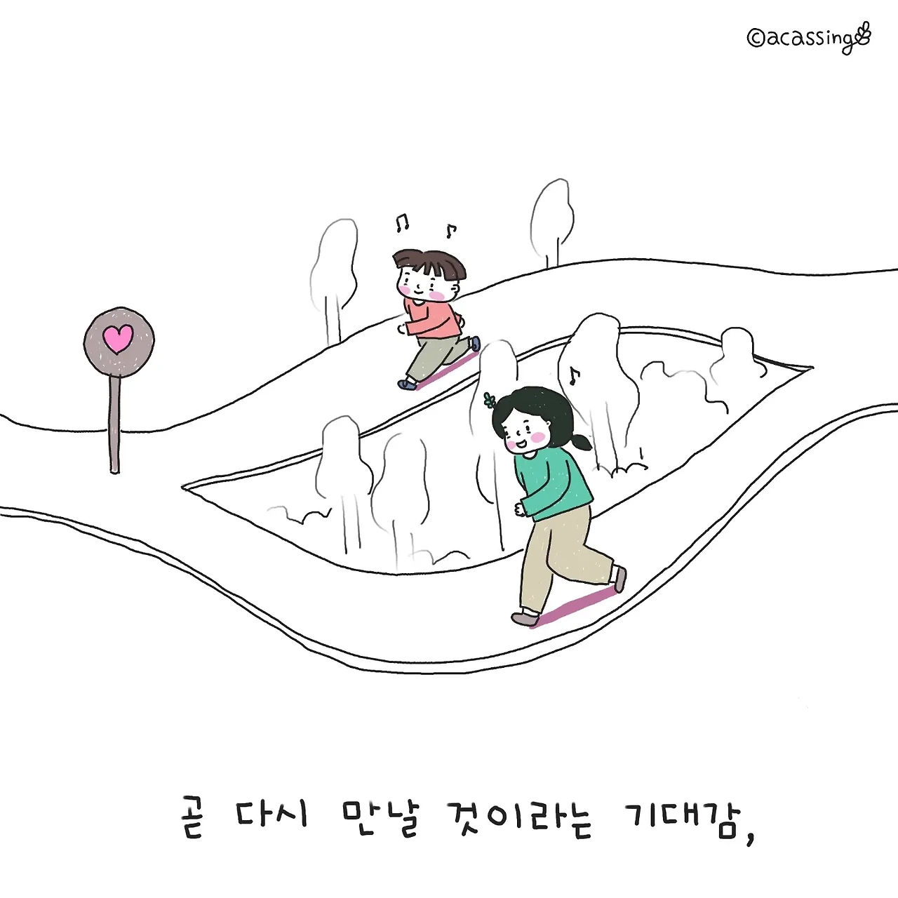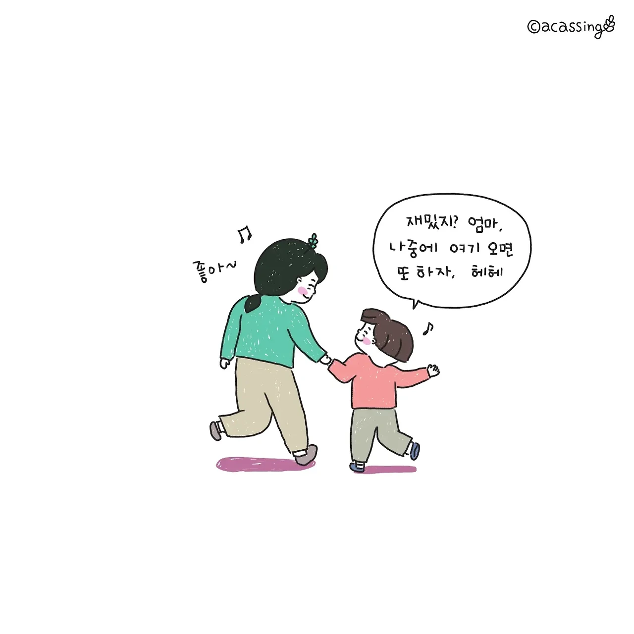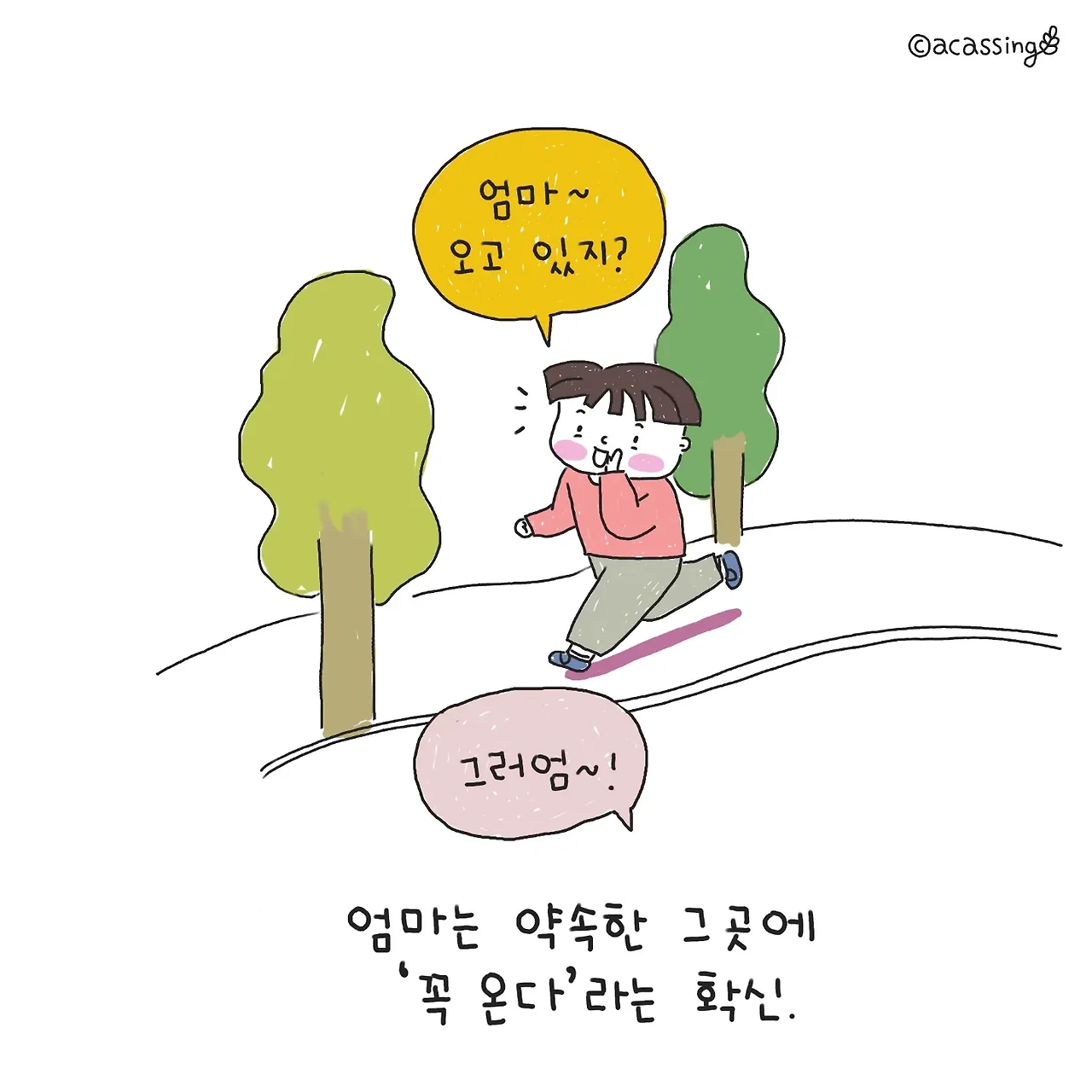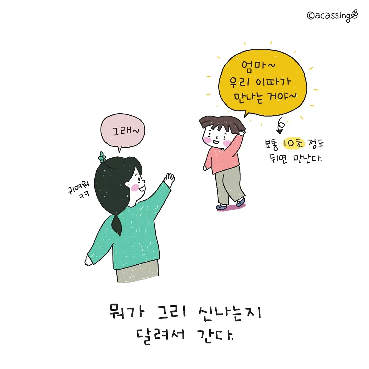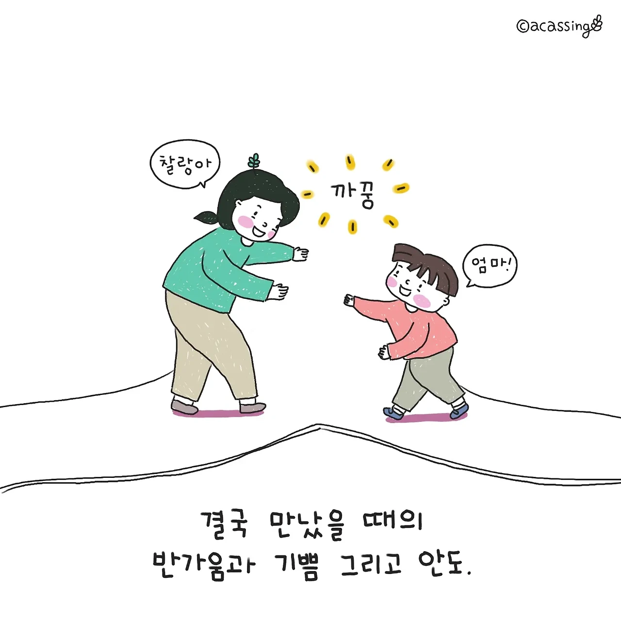 신나게 달려가는 아이를 보며 생각해 보니 많은 감정이 교차할 아이의 마음이 보인다. 낯선 길에서 짧은 순간 엄마와 헤어져 아찔하지만, 곧 엄마를 다시 만날 것이라는 기대감에 부풀어 신나게 뛰어갈 것이다. 드문드문 보이던 엄마가 혹여나 시야에 들어오지 않을 땐 "엄마 오고 있지?" 목청껏 소리치며 확인하는데, 아이의 작은 불안감을 다독여주기위해서는 "그럼~ 가고 있어"라고 최대한 크고 정답게 대답해 주어야 한다. 그러면 엄마는 약속한 곳에 '꼭 온다'라는 확신에 차 더 힘차게 달릴 것이다. 결국 합쳐지는 그 길에서 만났을 때 아이는 반가움과 기쁨 그리고 안도로 엄마를 꼭 끌어안는다. 간단한 놀이 같아도 그 안에 수많은 감정이 교차하고 있다. 그 마음이 느껴지기에 찡한 마음을 부여잡고 나 또한 힘껏 안아준다.