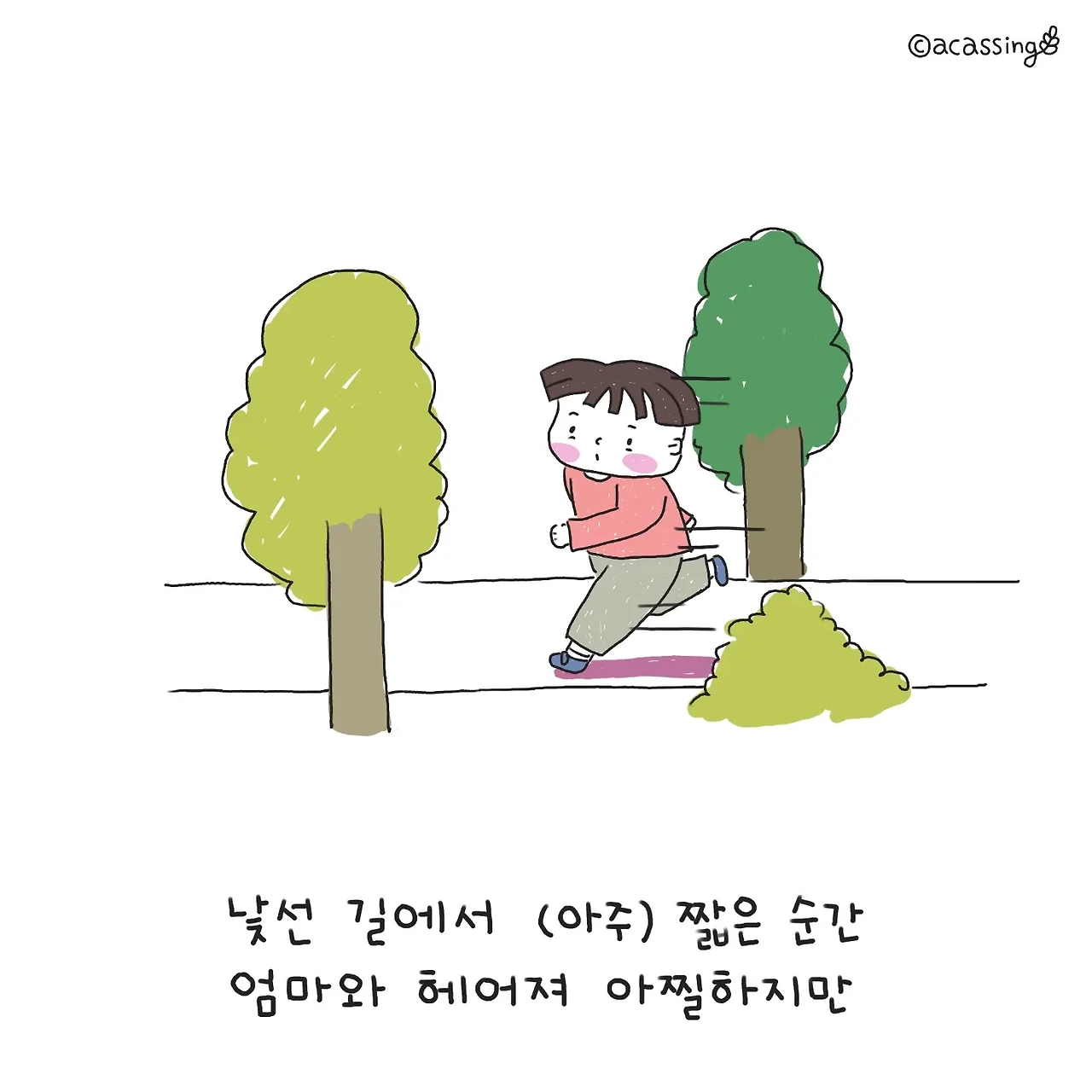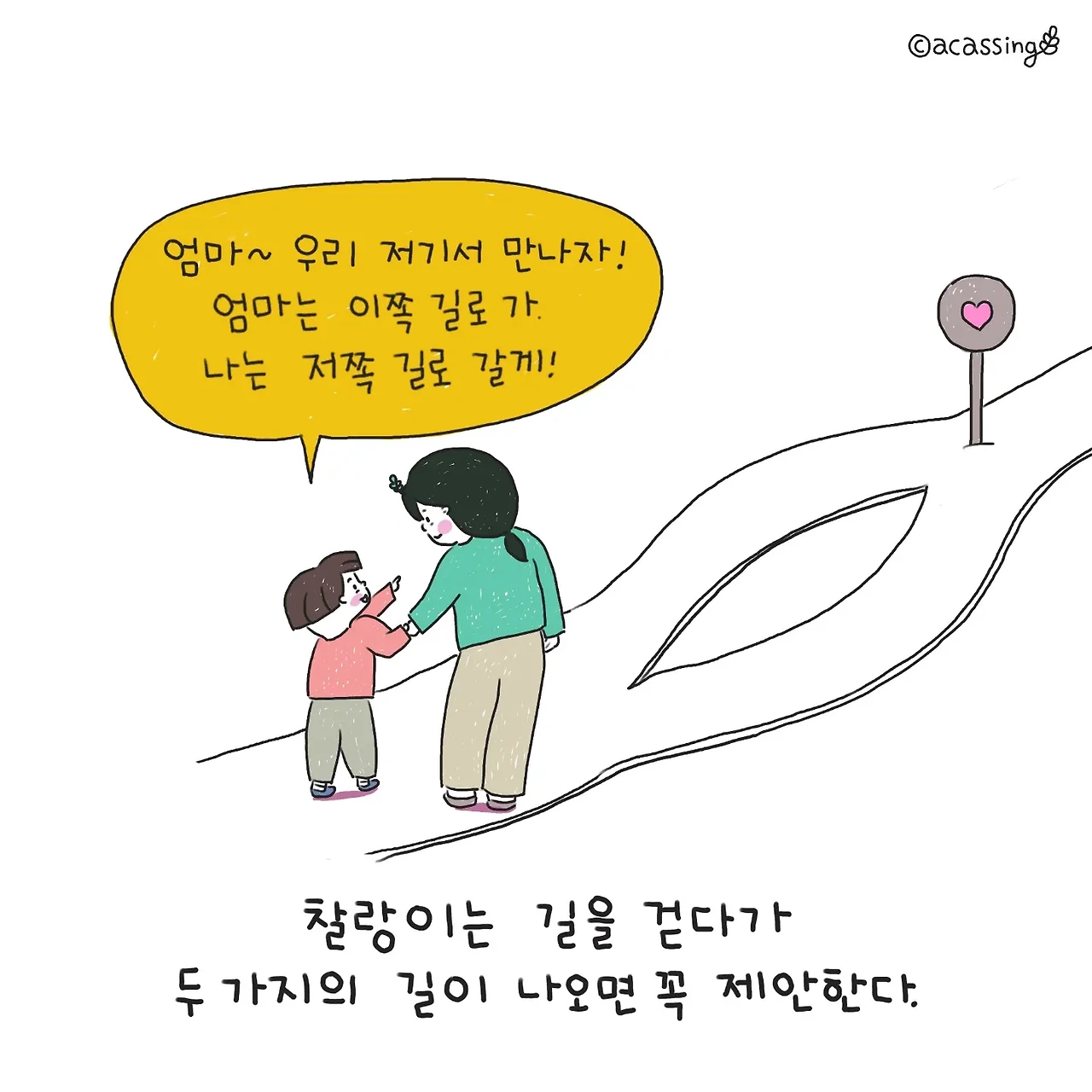 수차례 이 까꿍놀이를 하다 보니, 찰랑이가 제안하는 갈림길에는 몇 가지 조건이 있다는 것을 알게 됐다. 이 길은 보통 길어봐야 10초 정도 헤어지는 짧은 길이여야 하고 드문드문 엄마가 보여야 한다. 또 길이 갈라져 있어 잠깐씩 서로가 안 보이더라도 소리가 들리는 가까운 거리여야 한다. 이 조건들을 생각해 보니 엄마가 사라질까 걱정하는 조마조마한 마음이 보여 여섯 살도 아직은 아가구나 싶다.