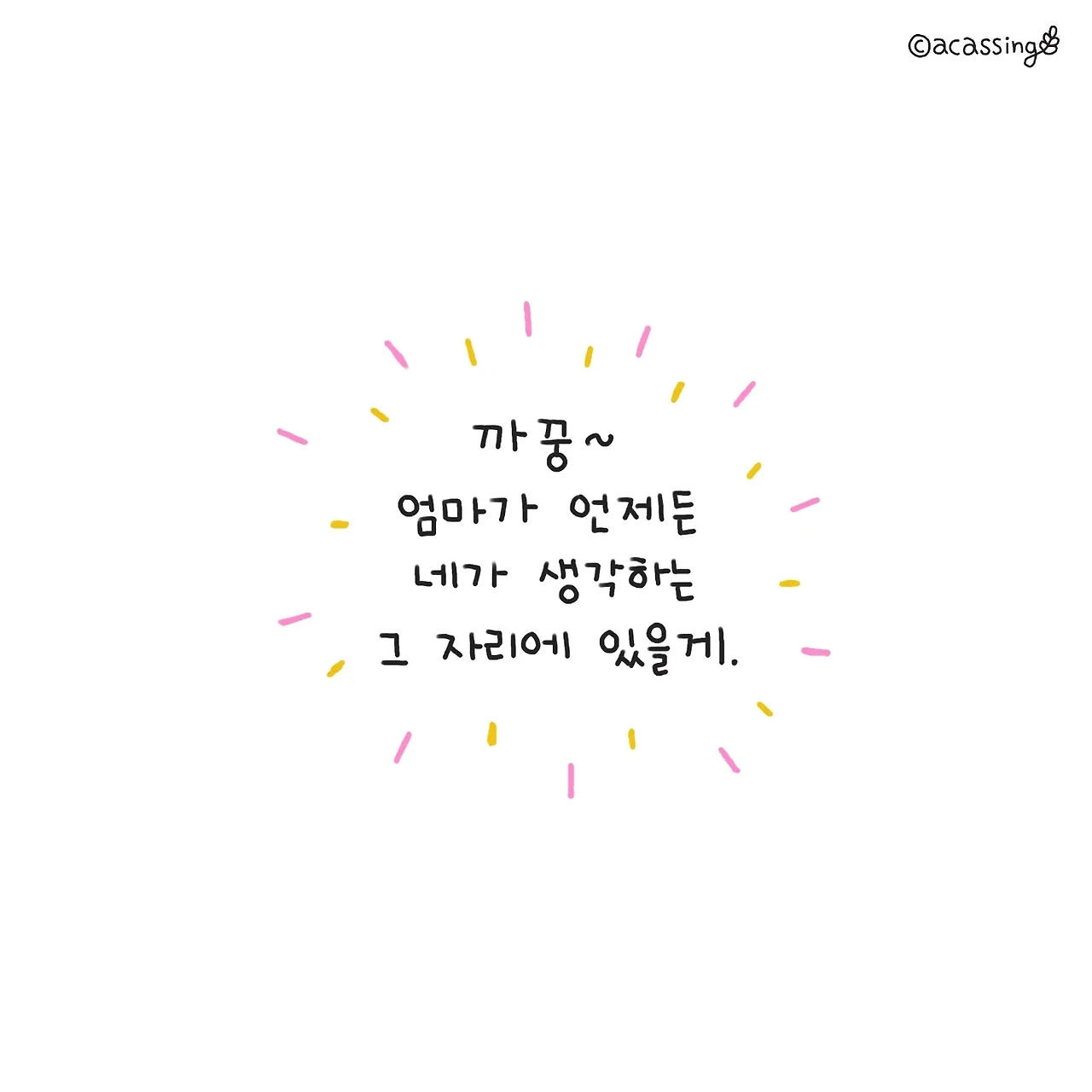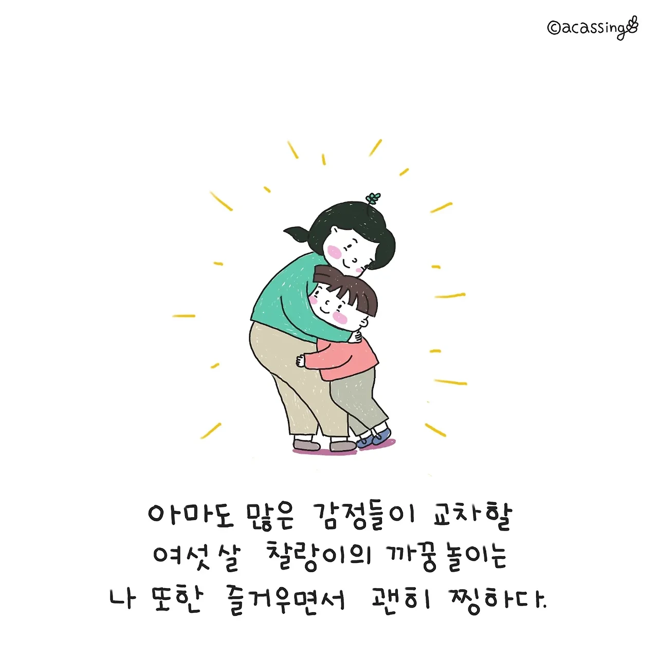 찰랑이가 성장하는 그 길에서도 까꿍으로 수시로 안아주고싶다. 아이가 길고 긴 자신의 길을 걷고 뛸 때 즐거울 때도 있지만 때로는 지치고 힘이 들고 또 버거운 순간이 올 것이다. 그때 언제라도 아이가 생각하는 그 자리에 서서 기다렸다는 듯 까꿍 하며 웃어 주고 싶다. 그렇게 따뜻한 위로이자 안도의 까꿍을 건네고 싶다.