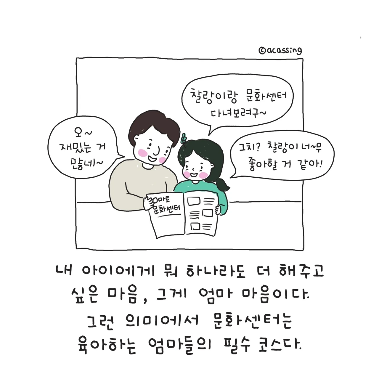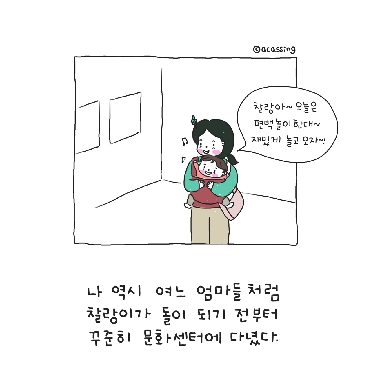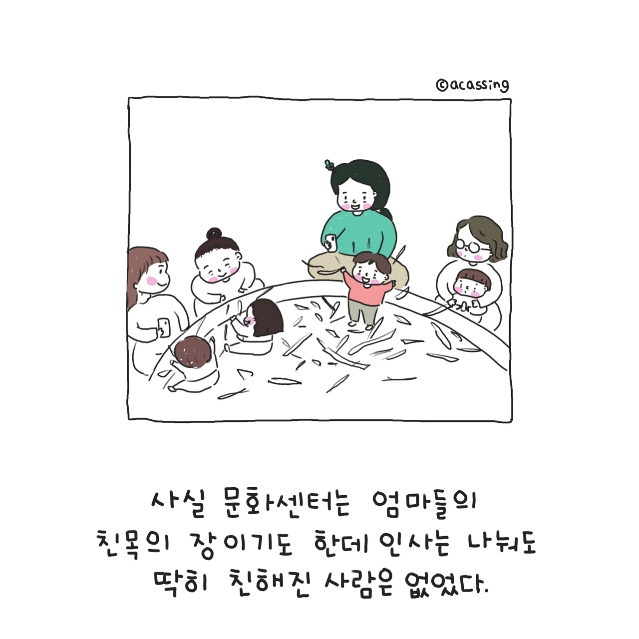 지독한 집순이 엄마를 밖으로 끌어내기에 충분했던 문화센터. 문화센터는 아이 키우는 엄마라면 필수코스다. 집에서 하기 힘든 다양한 경험을 할 수 있고 한껏 넘치는 아이의 에너지를 쏟기에도 좋다. 새로운 것을 거부감 없이 즐겁게 받아들이는 우리 찰랑이에게 정말 최적화된 시간이었다. 사실 문화센터는 육아하는 엄마들 간의 사귐이나 친목의 장으로도 유명하지만, 아이에게 쏟는 내 에너지만으로도 모자랄 판이었으니 누구를 사귈 여력은 크게 없었다. 조용한 내 시간을 즐기는 나에게 새로운 사귐은 어려웠고 버겁기도 했다. 그저 나의 가족들 가끔 연락할 오랜 친구 정도면 내 삶은 충분했고 또 감사였다.