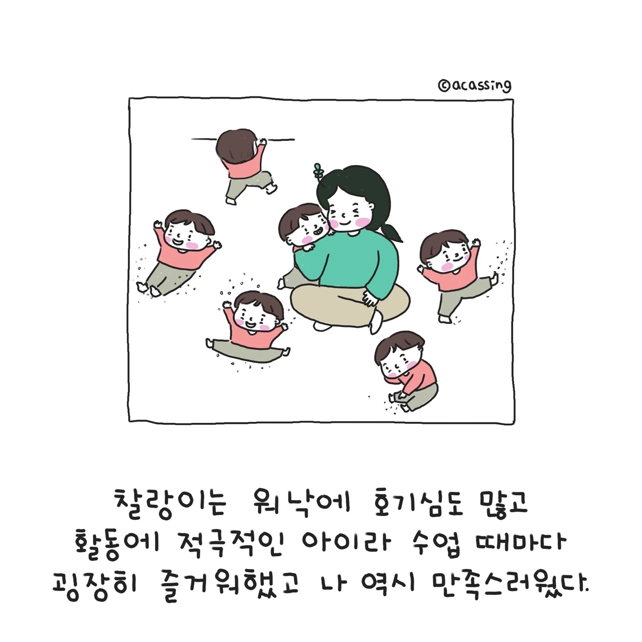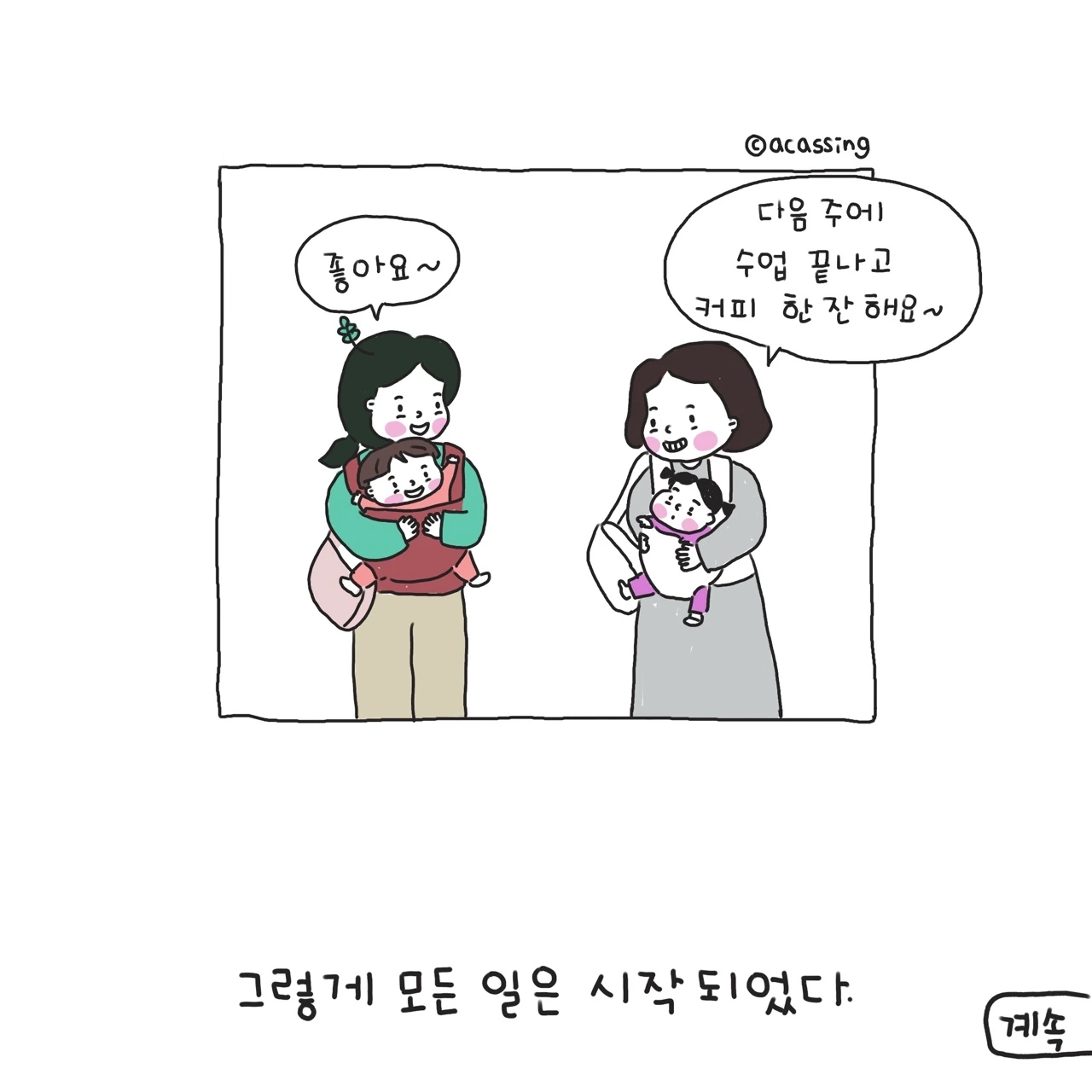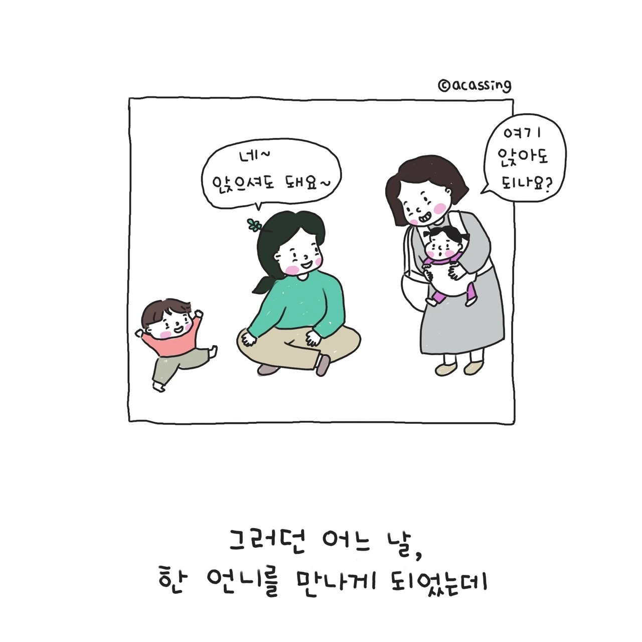 지독한 집순이 엄마를 밖으로 끌어내기에 충분했던 문화센터. 문화센터는 아이 키우는 엄마라면 필수코스다. 집에서 하기 힘든 다양한 경험을 할 수 있고 한껏 넘치는 아이의 에너지를 쏟기에도 좋다. 새로운 것을 거부감 없이 즐겁게 받아들이는 우리 찰랑이에게 정말 최적화된 시간이었다. 사실 문화센터는 육아하는 엄마들 간의 사귐이나 친목의 장으로도 유명하지만, 아이에게 쏟는 내 에너지만으로도 모자랄 판이었으니 누구를 사귈 여력은 크게 없었다. 조용한 내 시간을 즐기는 나에게 새로운 사귐은 어려웠고 버겁기도 했다. 그저 나의 가족들 가끔 연락할 오랜 친구 정도면 내 삶은 충분했고 또 감사였다.