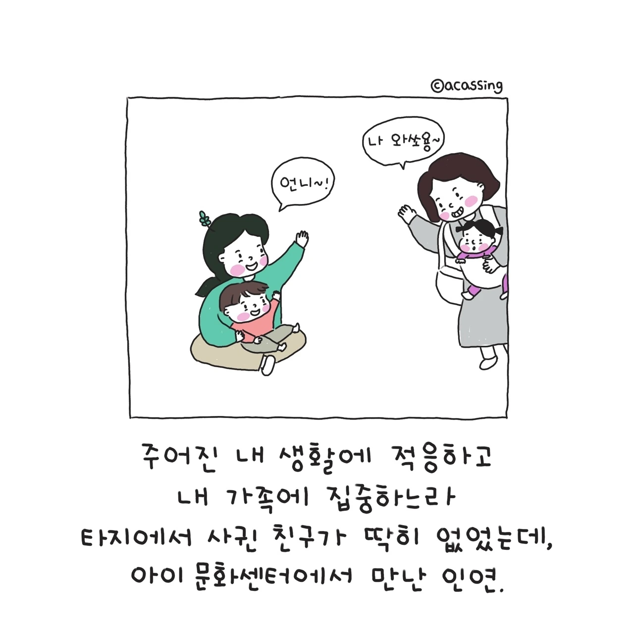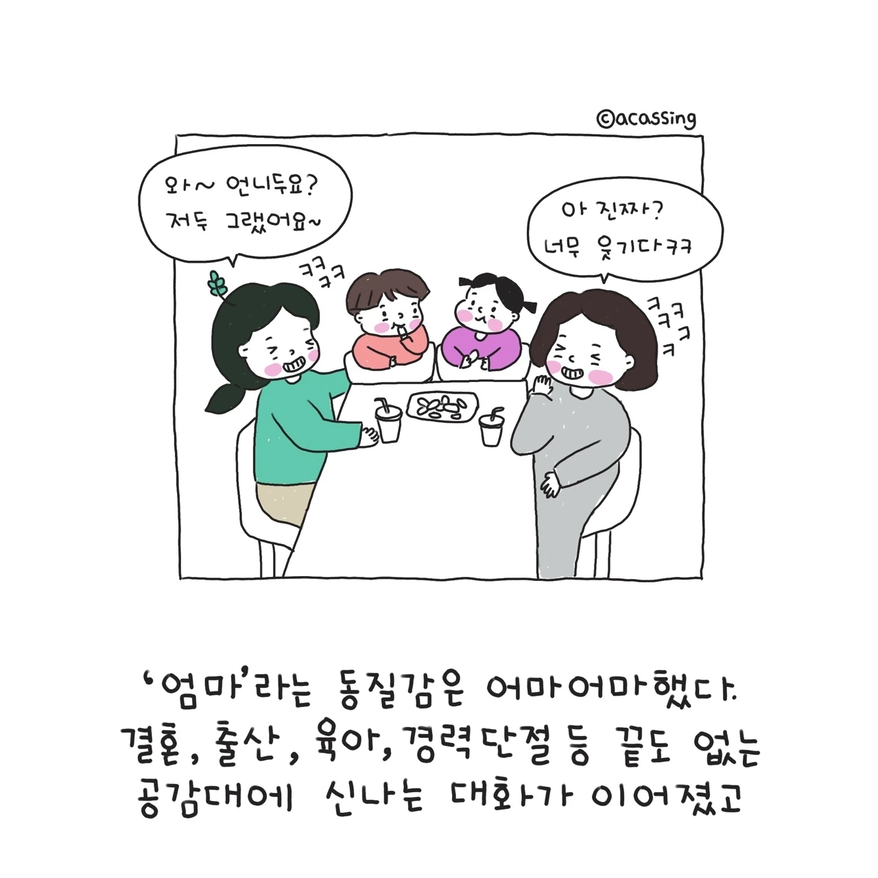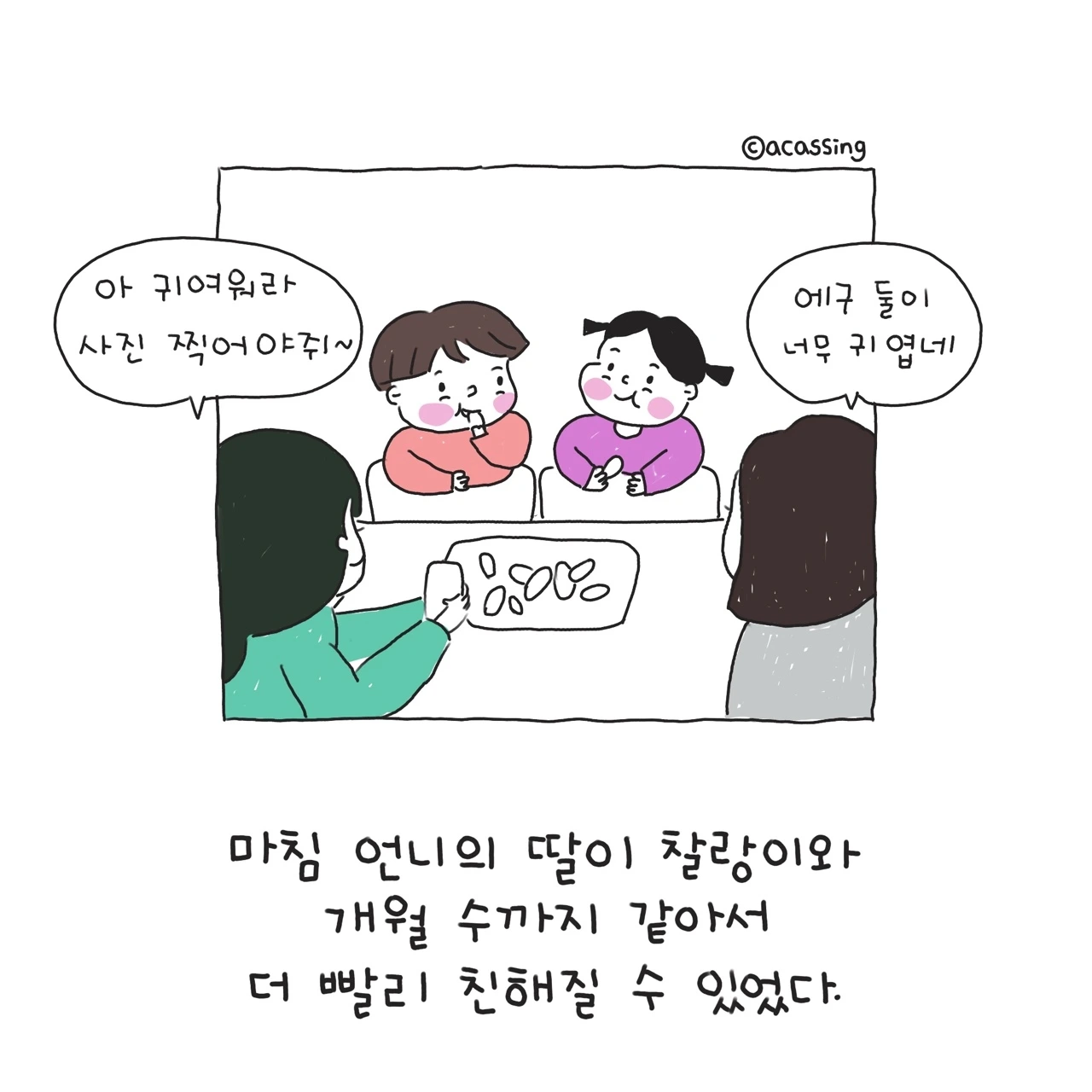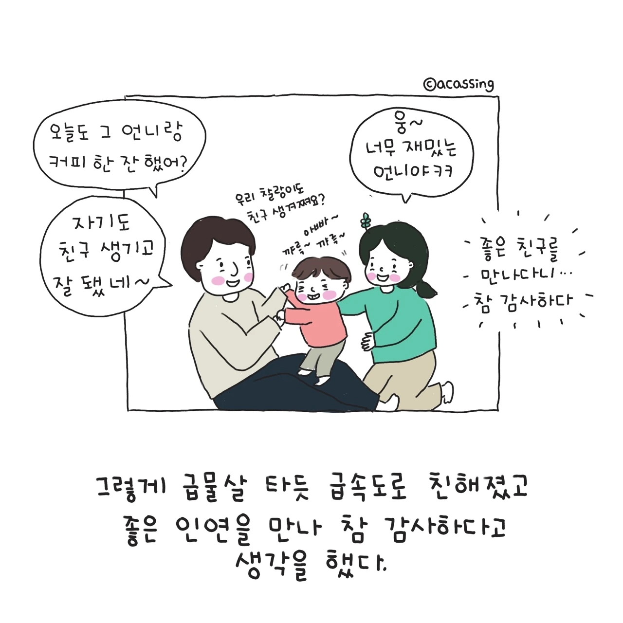 그 절묘한 타이밍에 행운처럼 만난 언니였다. 아이의 개월수까지 같았고 결혼, 출산, 육아에 이르는 끝도 없는 공감대에 속이 뻥 뚫리는 후련함이란. 정말 대단했다. 사실 친한 친구들 사이에 난 결혼을 제일 먼저 했고 혼자 아이까지 낳은 터라 제아무리 오랜 친구라도 공감대가 부족했다. 그런데 오래된 벗을 만난 것처럼 실타래 풀리듯 술술 통하는 즐거운 대화가 그저 신기했다. 엄마로서의 어마어마한 동질감에 하늘이 준 참 감사한 인연이구나 싶었다. 또한 유쾌하고격이 없이 농담도 주고받으며 함께 웃을 수 있는 언니였지만, 말을 놓으라는 내 권유에도 끝까지 나에게 존대해 주는 배려심까지 갖춘 좋은 언니라고 생각했다.