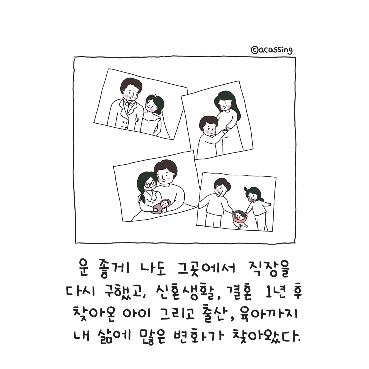 쭉 서울에서 살았고 직장생활도 서울에서 했지만 결혼을 하며 모든 것들을 접고 남편의 직장이 있는 천안에 신혼집을 꾸렸다. 어찌 보면 너무 과감했던 선택이었지만, 그 모든 걸 접을 만큼 남편에 대한 사랑과 믿음이 컸고, 타지에서 내 삶을 새롭게 꾸려갈 자신도 있었다. 생각지도 못하게 바로 새로운 직장을 얻었고, 신혼생활도 내가 그린 이상처럼 행복함이 가득했다. 1년 후 우리는 아이를 계획했고 임신, 출산, 육아에 이르기까지 모든 것이 순조로웠다. 마치 영화에서 주인공의 행복한 순간을 파노라마처럼 순식간에 요약해 나가듯 그렇게 결혼 후 나의 삶은 무난하게 물 흐르듯 하면서도 또 빠르고 정신없이 변화했다.