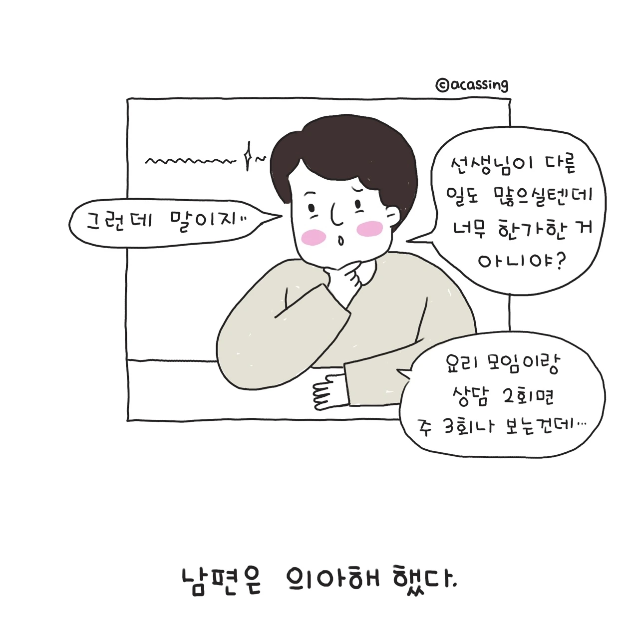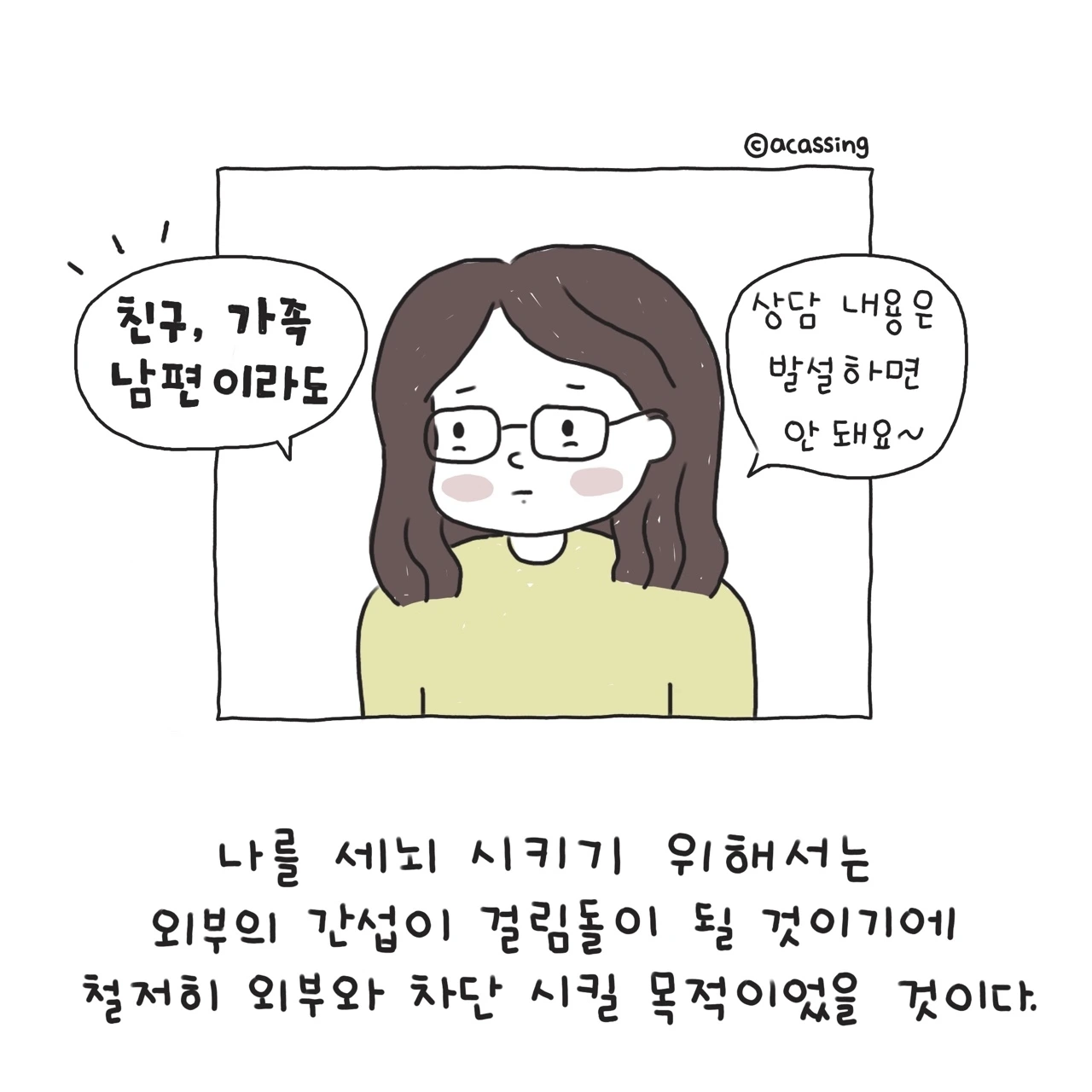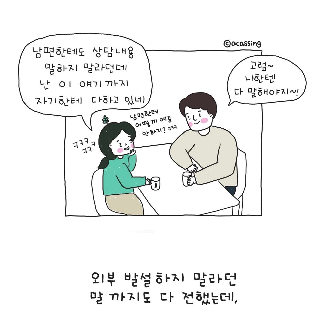 다만, 가족 그것도 남편에게까지 말하지 말라는 건 너무 하지 않나 싶었다. 퇴근한 남편과 하루 일과를 두런두런 나누는 것. 이것은 나에게 있어 하루의 깊은 갈증을 시원하게 해결해 줄 값진 일이다. 그런데 그걸 하지 말라니. 당연히 따를 리 없었다. 그게 참 다행이었다.