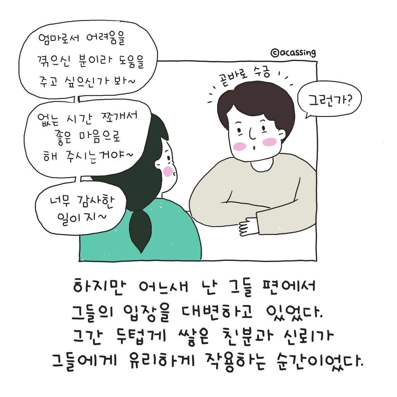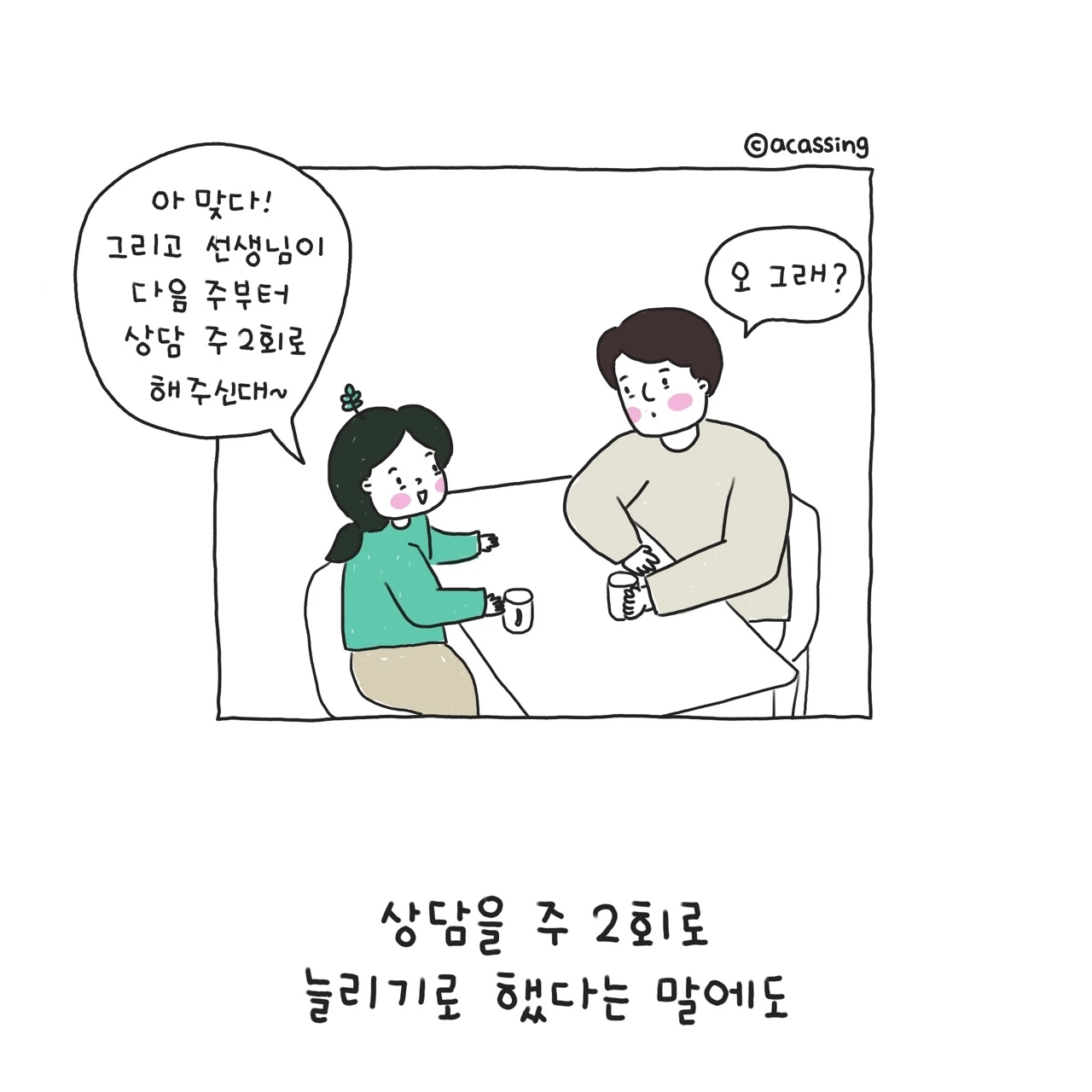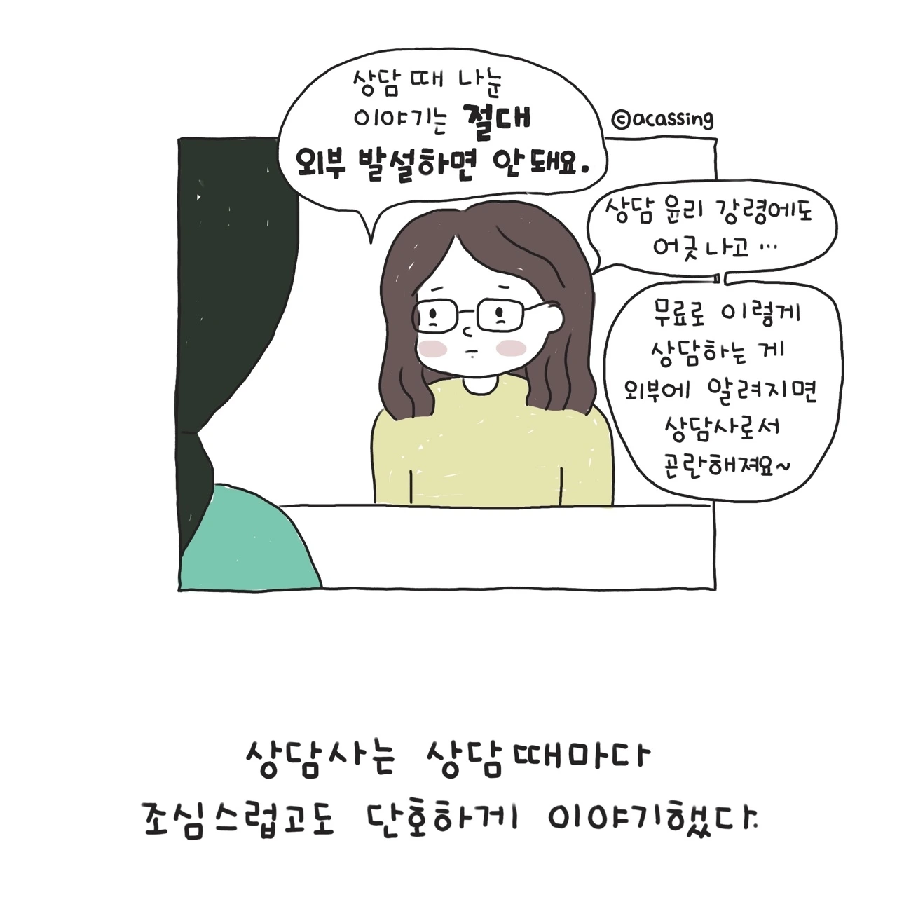 다만, 가족 그것도 남편에게까지 말하지 말라는 건 너무 하지 않나 싶었다. 퇴근한 남편과 하루 일과를 두런두런 나누는 것. 이것은 나에게 있어 하루의 깊은 갈증을 시원하게 해결해 줄 값진 일이다. 그런데 그걸 하지 말라니. 당연히 따를 리 없었다. 그게 참 다행이었다.