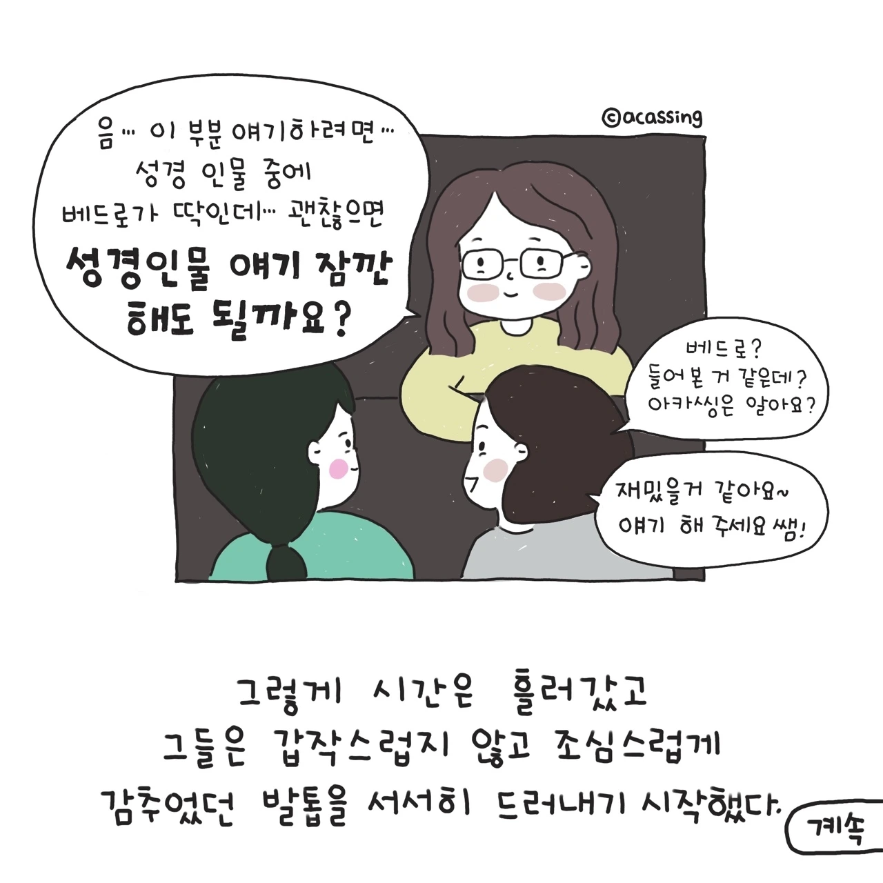 남편은 정신없이 앞만 보고 허둥대는 나를 주변을 돌아볼 수 있게 멈춰 세워주는 사람이다. 늘 그렇다. 내가 감정의 파도에 휩쓸릴 때도, 보이지도 않는 두려움들에 허우적댈 때도 조급하지 않게 멈춰 세워 붙잡아준다. 거짓 상황에 몰입되고 그들이 파놓은 구덩이에 매몰 직전이었지만, 남편은 환기할 수 있는 창구멍을 내주었다. 그 구멍으로 잠시 멈추어 새로운 호흡을 해볼 수 있었다. 물론 당시 의문을 제기하는 남편에게 소름 끼치게도 그들의 입장을 대변하는 나였지만, 머릿속에 작은 물음표 한 개라도 품을 수 있었다는 게 다행이었다.