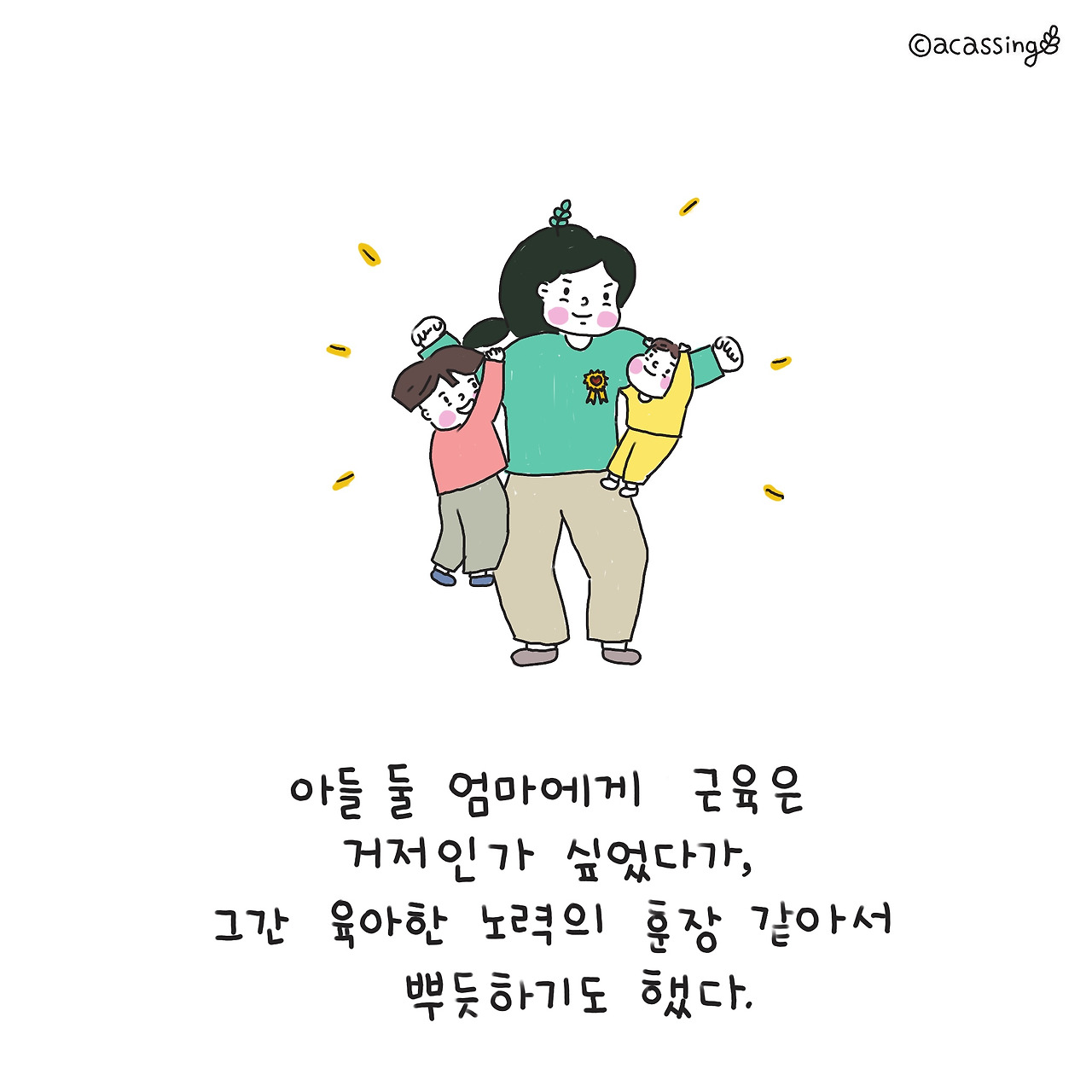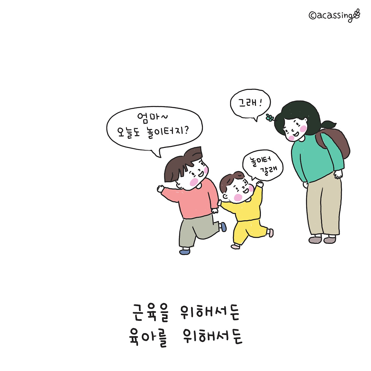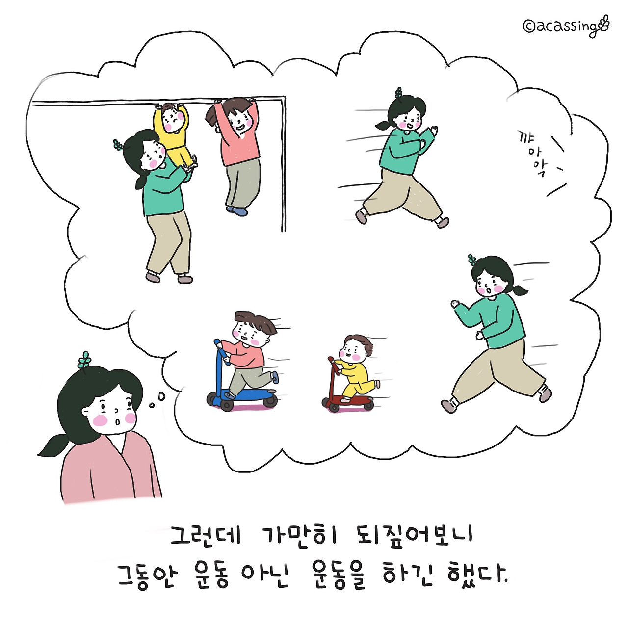 할 말이 많았지만 꾹 눌러 담고 얼른 문진실을 빠져나왔다. 그런데 그 말이 자꾸자꾸 생각난다. 잘하고 있다는 그것이 (놀이터) 운동인지, 육아인지, 내 지금 삶인지 여러 가지 의미로 들린다. 그렇게 마음을 울려댄다. 난 정말 잘하고 있고 지금처럼만 살아가면 되는 걸까? 마음속으로 질문을 던져 보다가 괜히 힘이 났다. 내 몸에 자라난 근육만큼 내 마음의 근육도 증량됐다는 확신이 들었기 때문이다. 2년 뒤의 나는 또 어떻게 달라져 있을까? 내심 기대를 품고 오늘도 열심히 아이들과 놀이터를 뛰노리라 다짐했다.