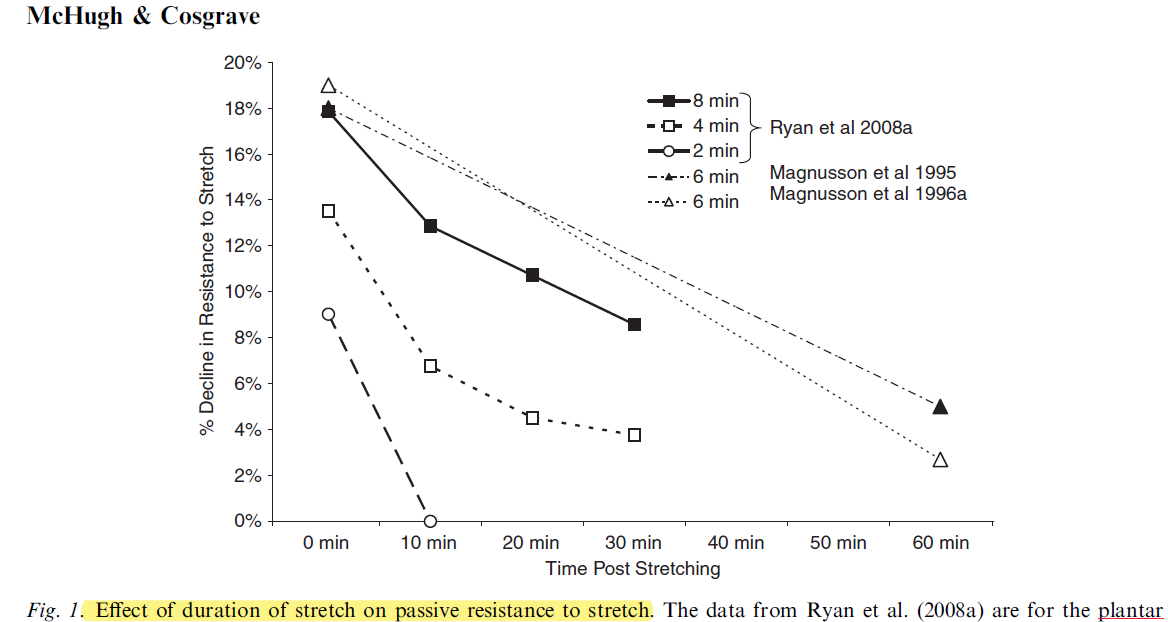2008년에 진행된 Ryan 박사의 연구에서, 스트레칭이 진행된 시간이 길수록 스트레치에 대한 저항성 감소가 크고, 오래 지속되었다는 걸 확인할 수 있습니다. 4분 미만으로, 2분 동안만 스트레칭이 진행된 경우에는 스트레칭 진행 후 10분이 경과했을 때 스트레치에 대한 저항성 감소 효과가 소멸된 것을 확인할 수 있습니다.