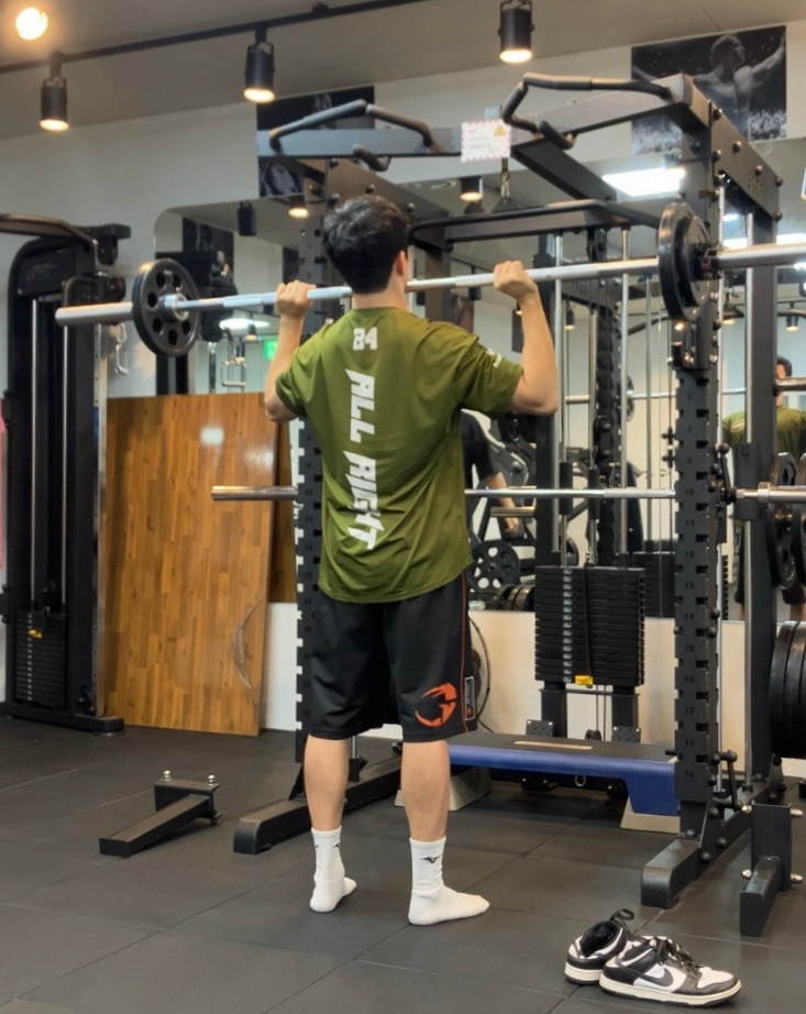 또한 숄더 프레스 시에도 정면을 응시하도록 하는 게 편하신 분도 있고, 천장을 응시하도록 하는 게 편하신 분도 있습니다.