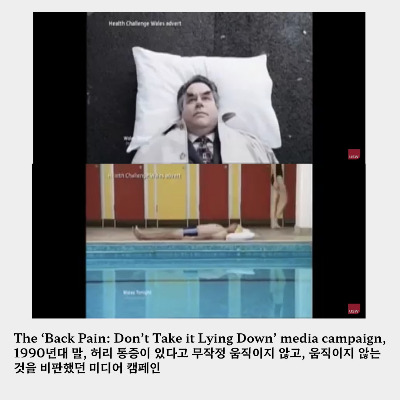 1990년대 말, 호주에서 허리 통증이 있는 사람들을 무작정 움직이지 않게 하는 사람들과, 자처해서 허리 통증이 있을 때 활동량을 줄이는 사람들을 비판하는 미디어 캠페인이 열린 적이 있습니다. 결과적으로, 이 캠페인을 통해 의료비용을 줄이는 데 긍정적인 효과가 있었다고 하네요.