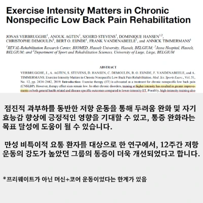 2. Verbrugghe J, Agten A, Stevens S, Hansen D, Demoulin C, O Eijnde B, Vandenabeele F, Timmermans A. Exercise Intensity Matters in Chronic Nonspecific Low Back Pain Rehabilitation. Med Sci Sports Exerc. 2019 Dec;51(12):2434-2442.