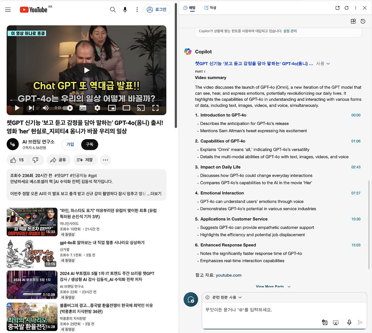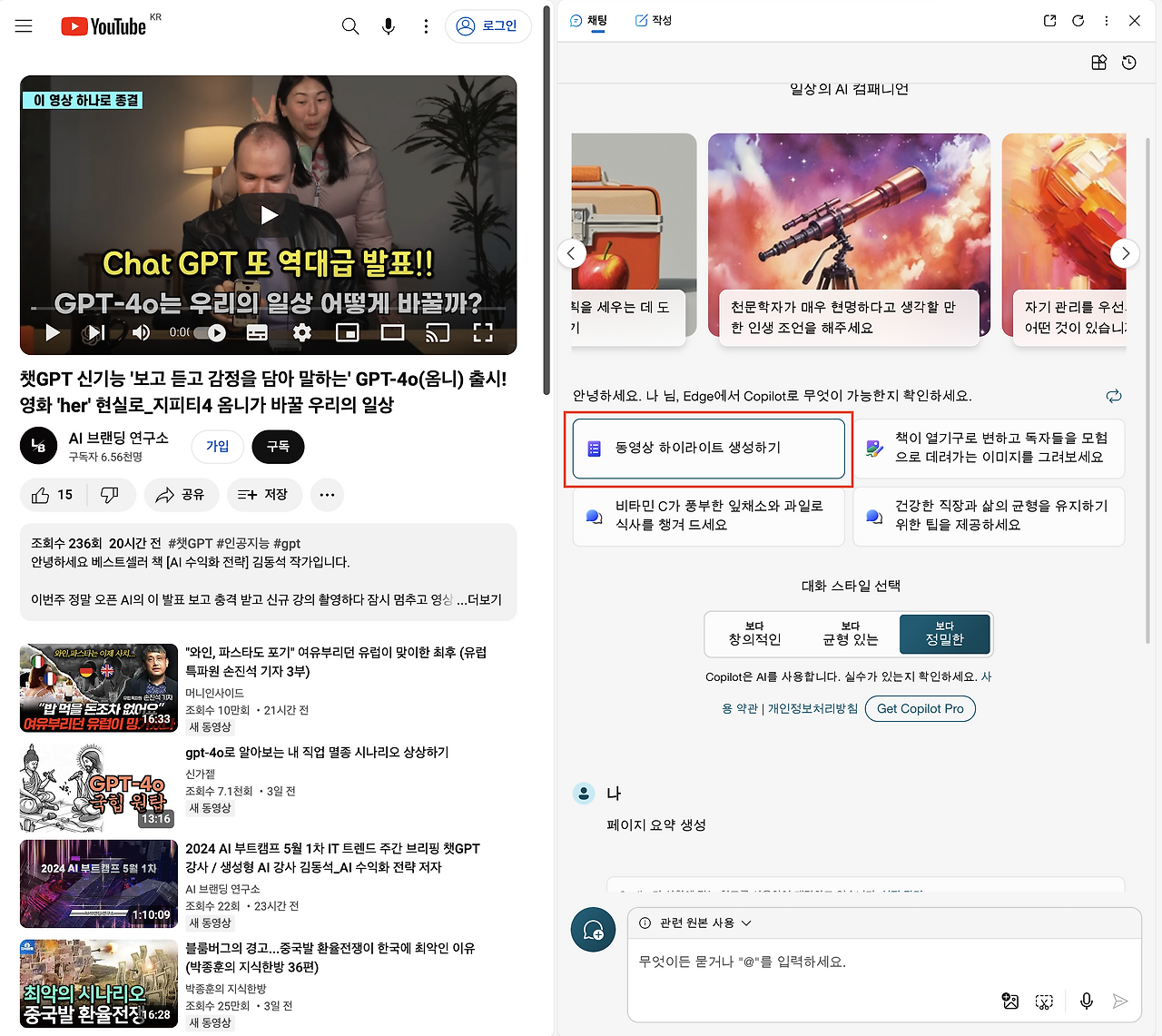 참고로 'Edge 브라우저 Bing 사이트'에서 구글 뉴스는 잘 요약되지만, 네이버 뉴스나 유튜브 동영상은 잘 되지않습니다. 하지만 'Edge 브라우저 사이드바' 를 사용하시면 잘 되는점 참고하시기 바랍니다. 동영상을 요약하려면 '동영상 하이라이트 생성하기' 버튼을 클릭하면 됩니다. 또한 웹 PDF 문서에 대한 요약이나 인사이트 생성도 가능하니 논문이나 가이드 문서도 쉽게 볼수 있을것 같습니다.