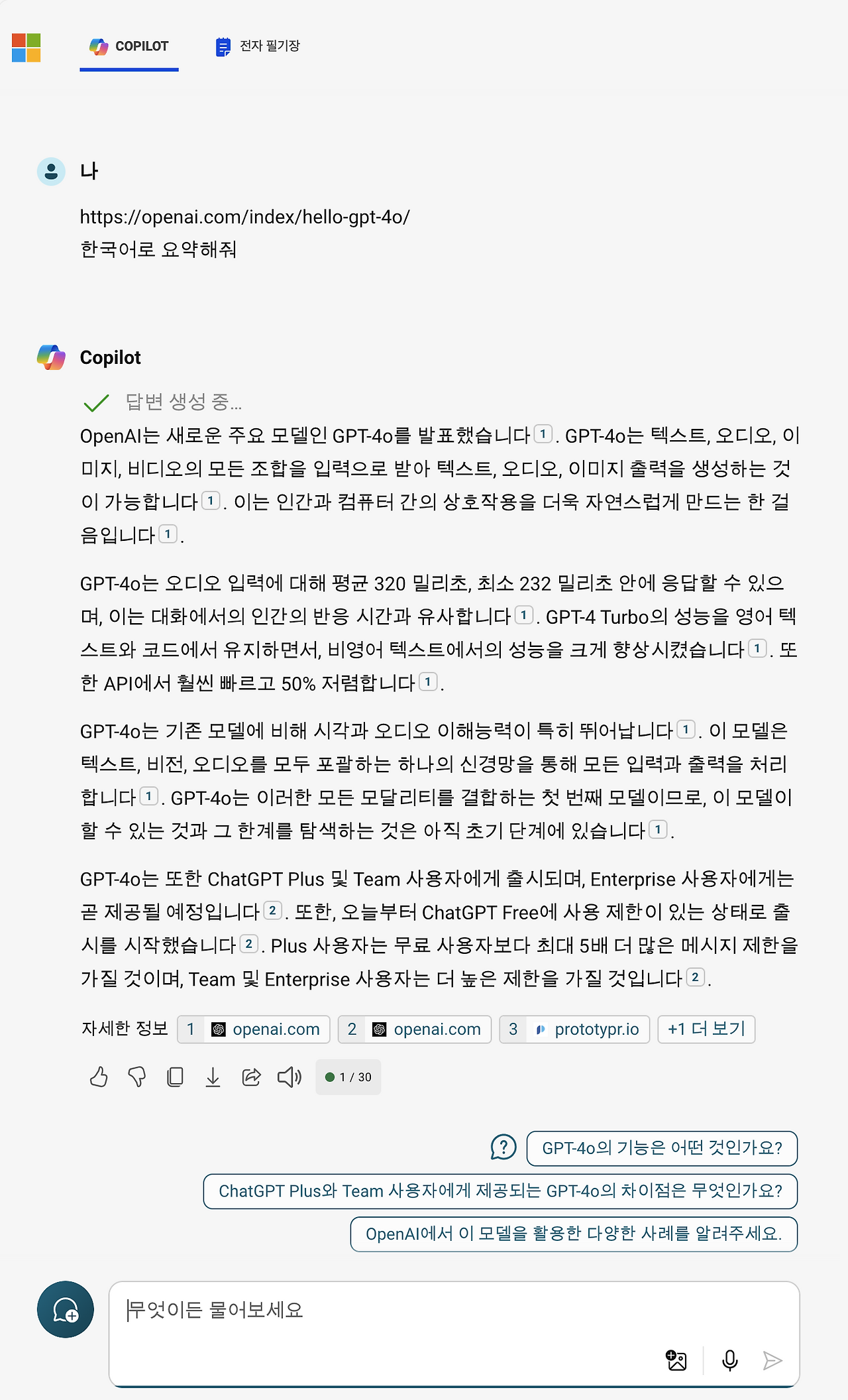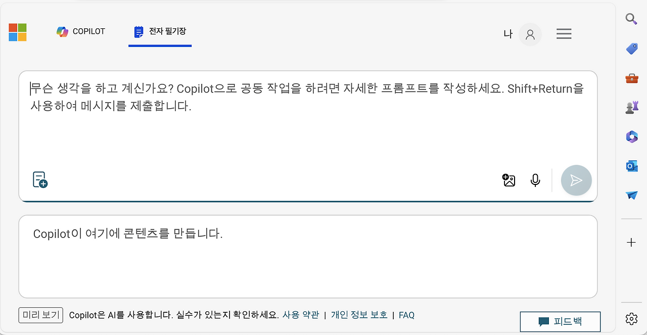 Copilot 과 상호 작용하는 새 방식이며 사용자가 상단 텍스트 프롬프트를 입력하면, 하단 Copilot 응답을 볼수 있는 인터페이스를 제공합니다. 전자 필기장은 특히 복잡한 질문이나 프로젝트를 다룰 때 유용하며, PC와 모바일에서도 사용할 수 있습니다