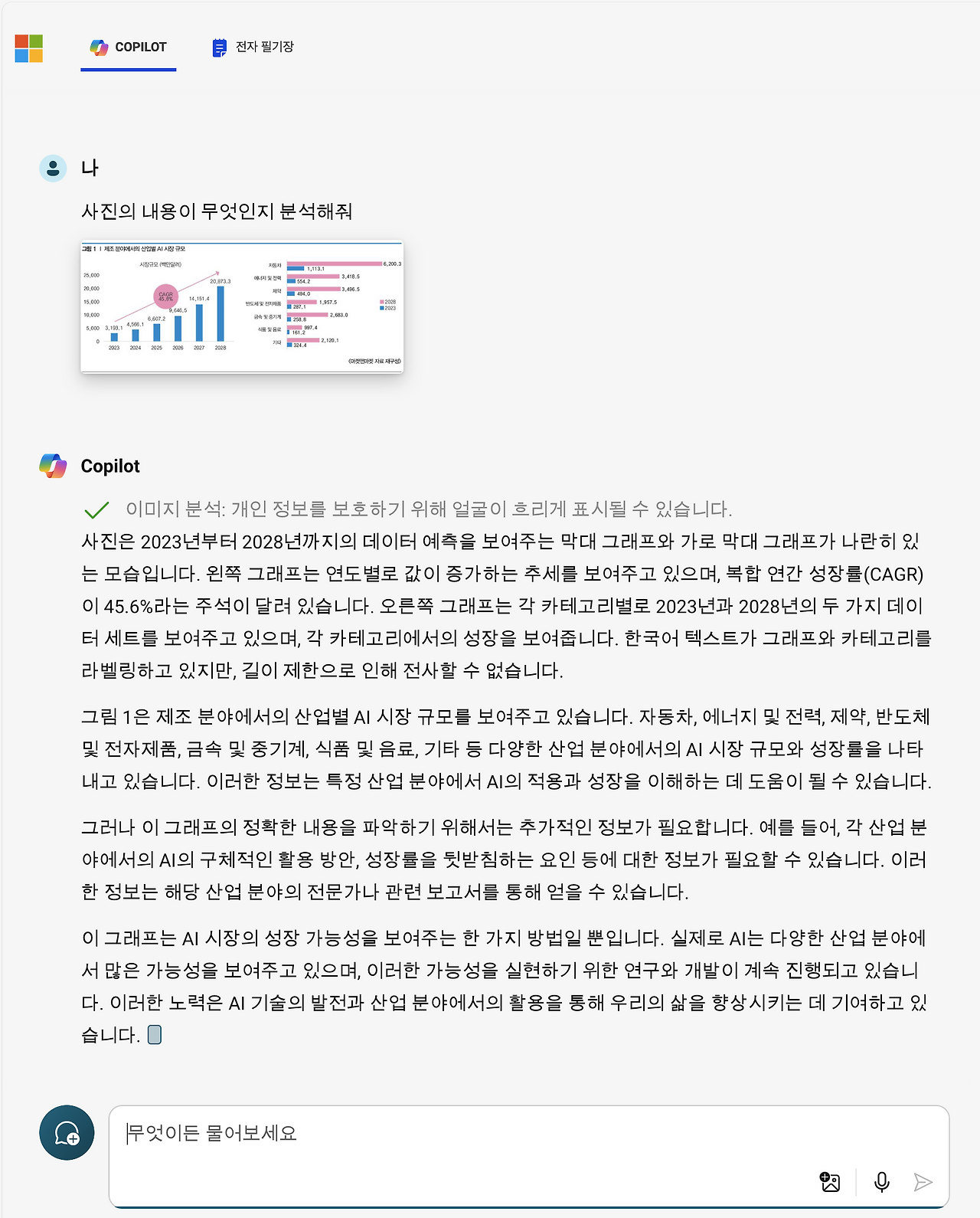 고급 이미지 분석 기능을 통해 사용자가 업로드한 이미지를 이해하고 분석합니다. 이 기능은 이미지의 주요 내용을 파악하고, 그에 따라 사용자의 질문에 대한 답변을 제공하거나, 이미지에 대한 설명을 생성하는 데 사용됩니다. 예를 들어, 사용자가 특정 동물이나 건물의 사진을 업로드하면, 코파일럿은 그 이미지를 분석하여 해당 동물이나 건물에 대한 정보를 제공할 수 있습니다. 또한, 이미지에 표시된 텍스트를 인식하고 이해하는 능력도 가지고 있습니다. 이를 통해 이미지에 포함된 텍스트에 대한 질문에 답하거나, 텍스트를 다른 언어로 번역하는 등의 작업을 수행할 수 있습니다. 이러한 기능은 코파일럿이 사용자와의 대화에서 더욱 풍부하고 유익한 정보를 제공하는 데 도움을 줍니다.